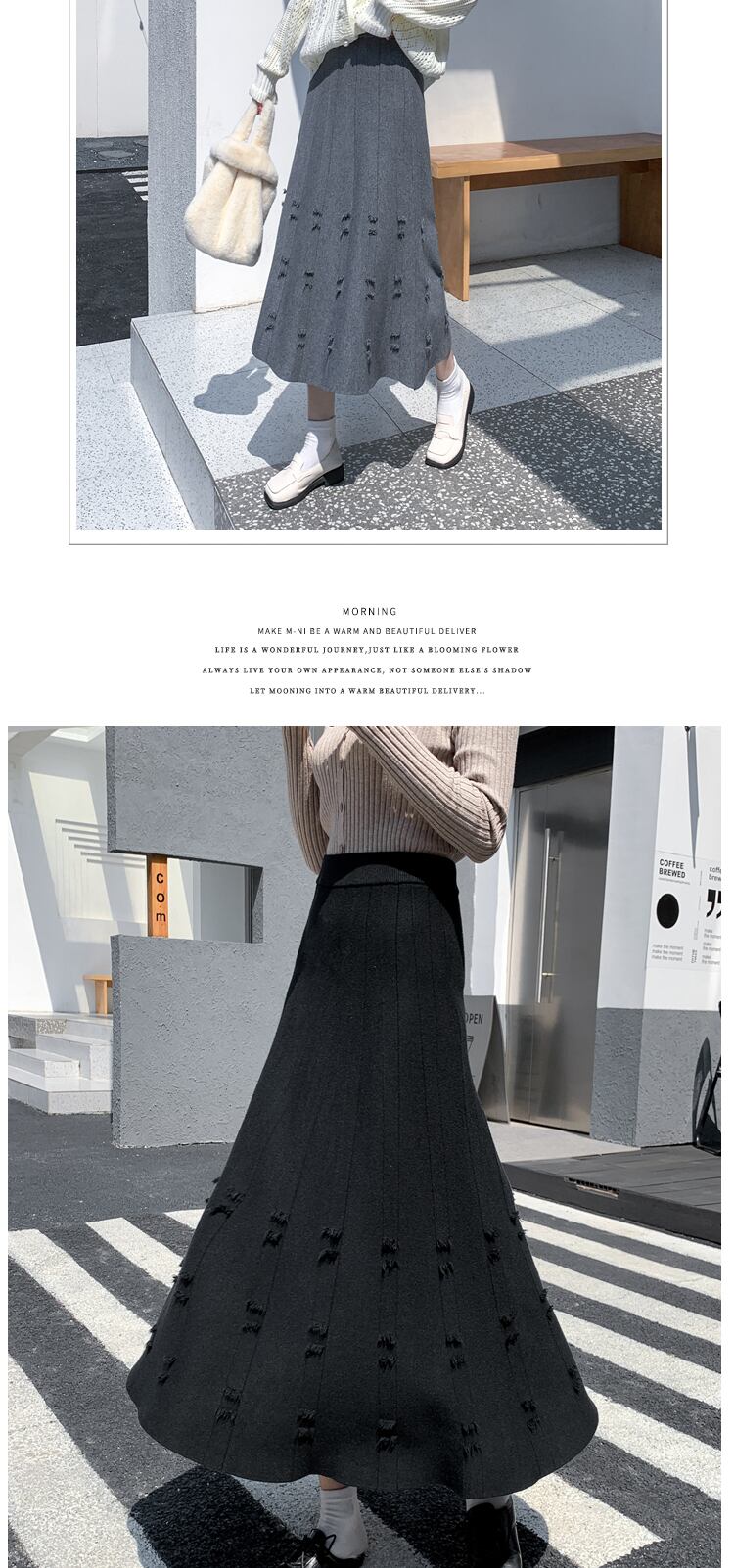 冬の厚手のリブニット大振りマキシロングスカート無地Aラインプリーツアンクル丈ニットスカート ウィンター 冬物 ソリッドカラー Rhc34316556574