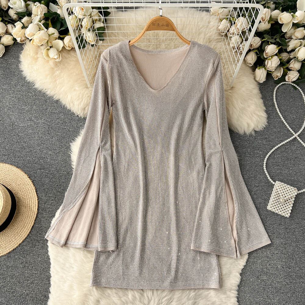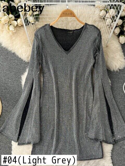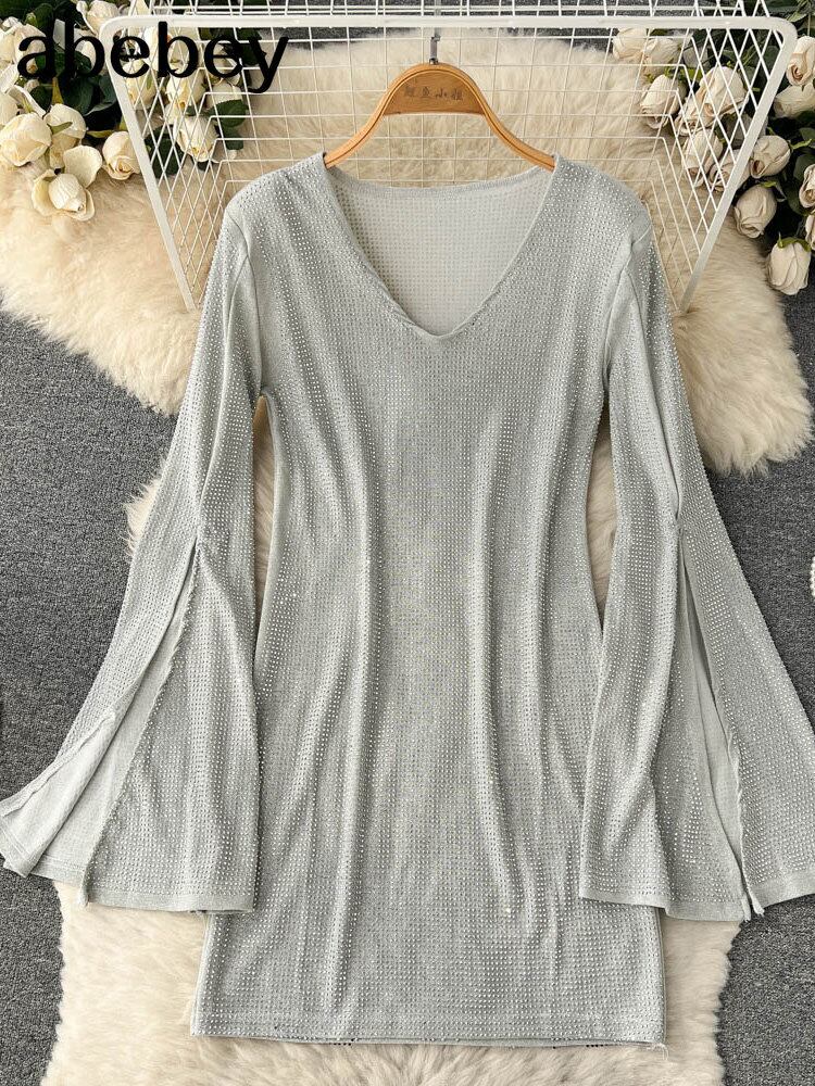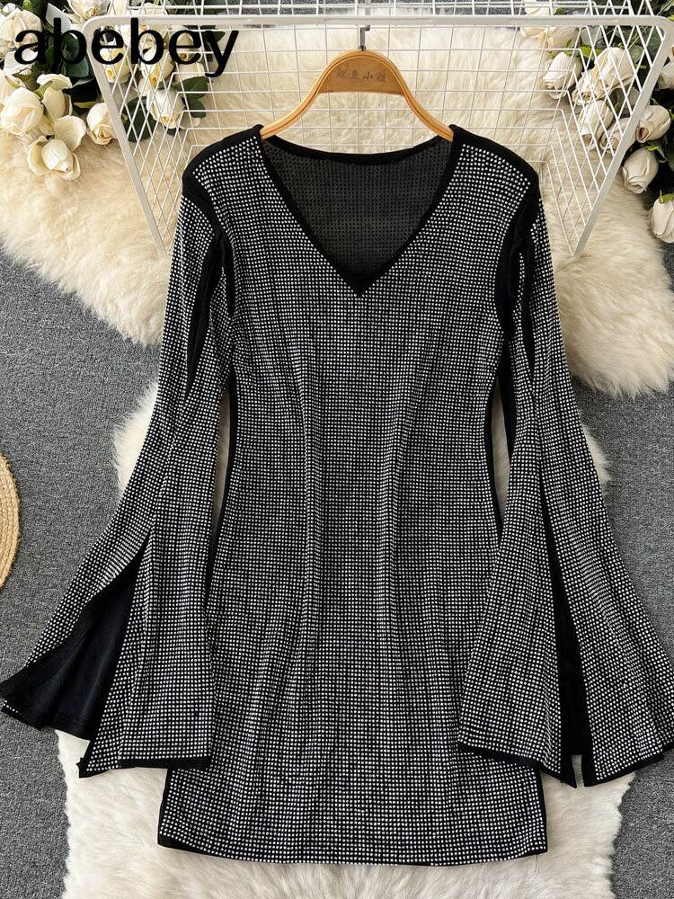 秋の女性のセクシーな黒ブリンブリンダイヤモンドボディコンミニドレス春 V ネック長袖ウエストパーティー Vestidos ロング ブラック スプリング 春物 オータム 秋物 Vネック Abe44934129502