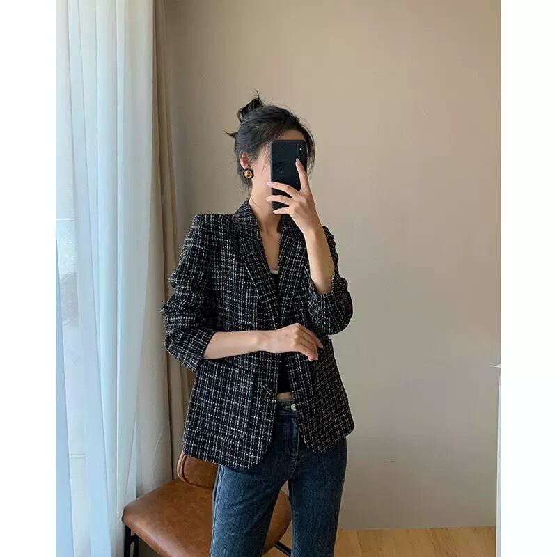 秋冬ツイードチェック柄ブレザージャケット女性ストリートポケットスリムスーツコートオフィスブレザートップ オータム 秋物 ウィンター 冬物 会社 学校 通勤や通学にも Rhc57862162414