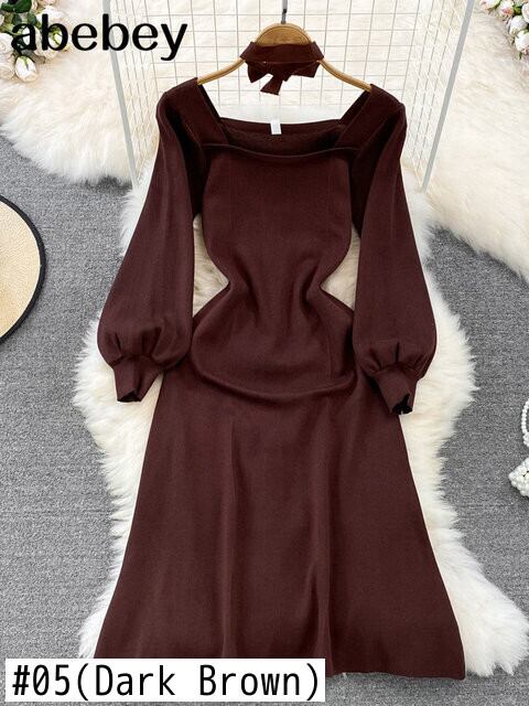 女性ニット A ラインドレス長袖弾性スリムドレス秋冬セクシーなスクエアカラー暖かいセータードレス ロング エラスティック 伸縮 オータム 秋物 ウィンター 冬物 Aライン スクウェア Abe98420057123
