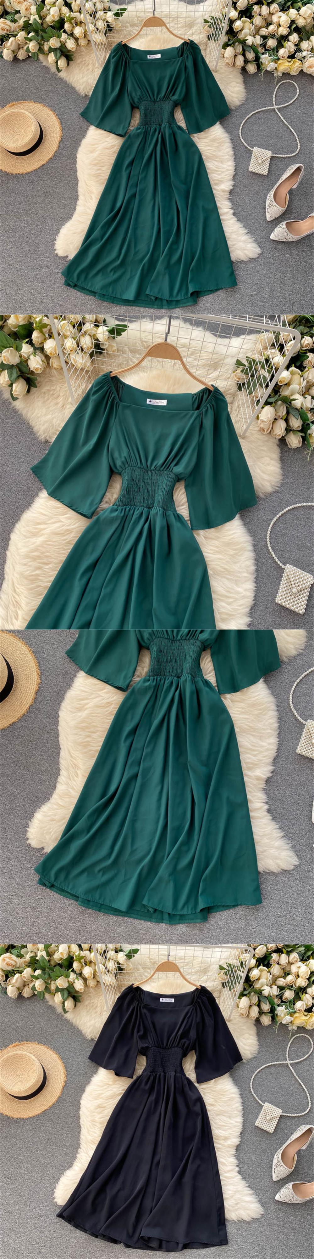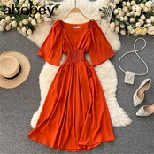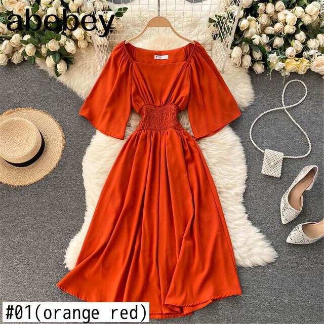 女性フレンチレッドサマードレス 2022 スリムウエスト半袖ミディドレス弾性パーティーガウンサンドレス ショート ハーフスリーブ エラスティック 伸縮 夏物 Abe90310362070