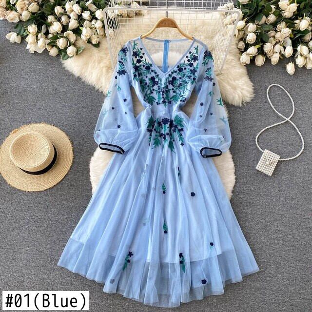 Woemn メッシュ刺繍ドレスフレンチロングスリーブ V ネック A ラインドレスストリート 2022 春ミディドレス 長袖 スプリング 春物 Vネック Aライン Abe21109070421