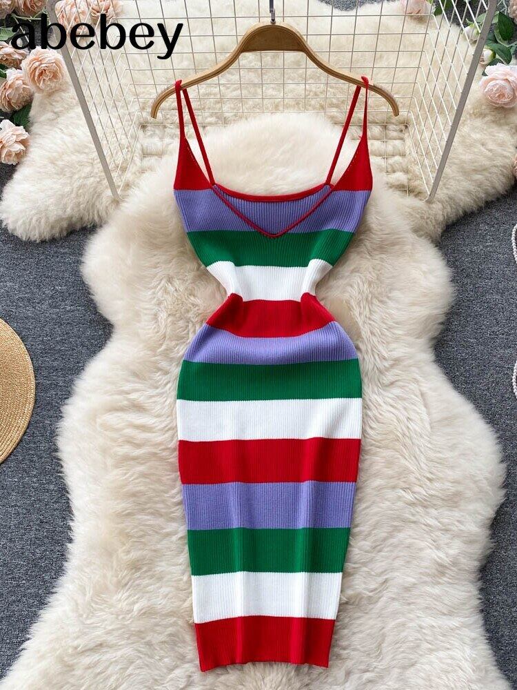 ストライプ夏ニットセクシーなストラップドレス女性 V ネック Elatic ウエストボディコンサンドレスビーチ背中の開いたミディドレス サマー 夏物 Vネック Abe6130688105