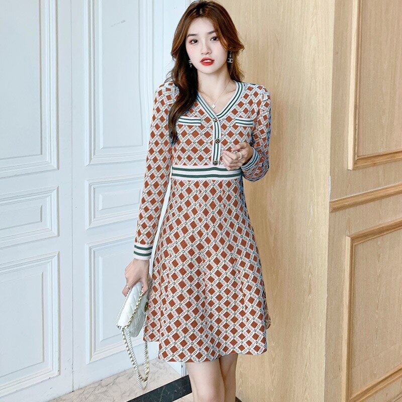 2021 秋冬セータードレス女性長袖チェック柄オフィスボタンアップニットパーティードレス Vestidos ロング オータム 秋物 ウィンター 冬物 会社 学校 通勤や通学にも Rhc72612030056