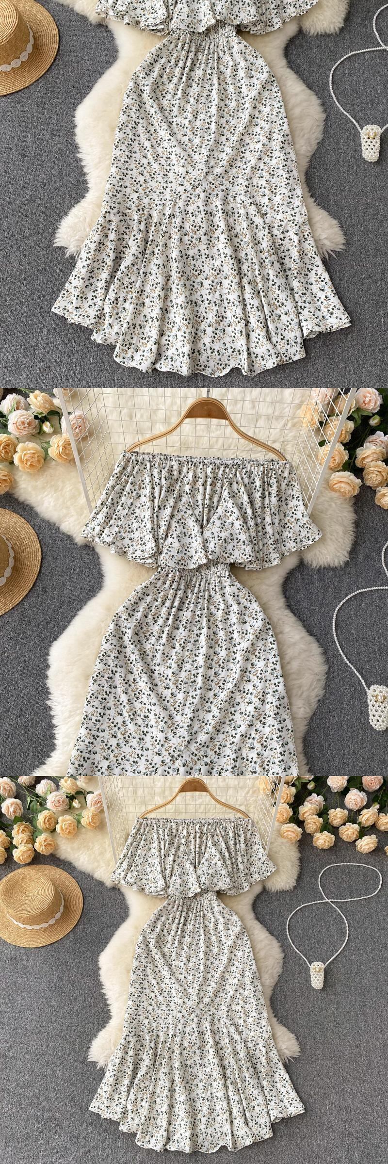 夏フレンチ花柄ドレス女性スウィートセクシーなスラッシュネックオフショルダー A ラインドレス自由奔放に生きるプリント休暇ビーチサンドレス 大人ガーリー キュート カジュアル サマー 夏物 Aライン Abe73412964116