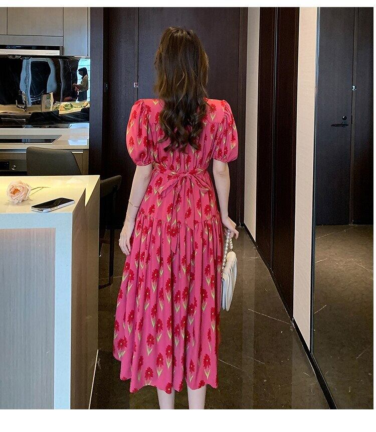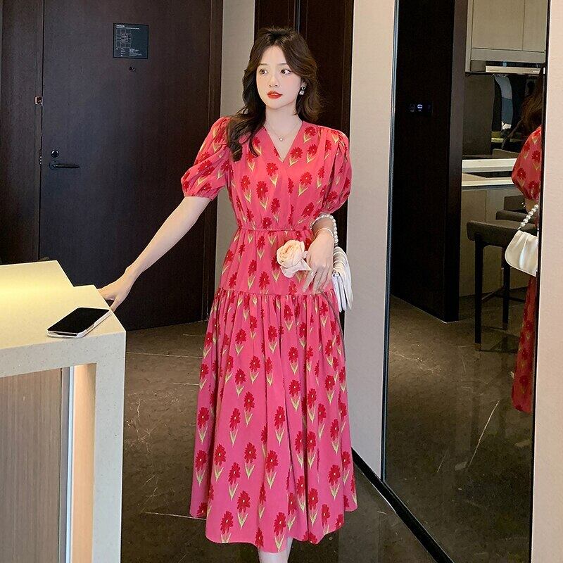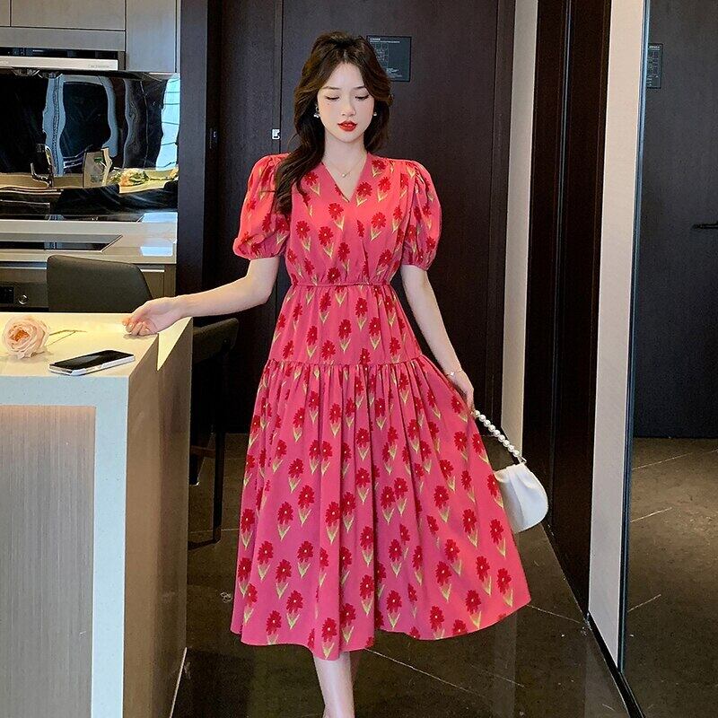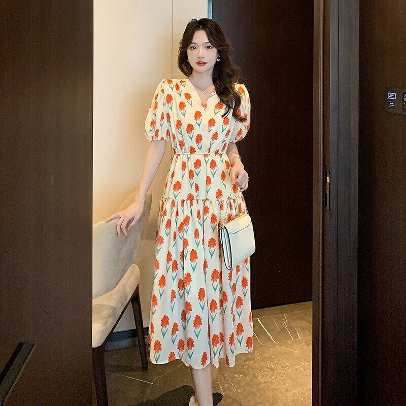 優しい V ネック ドレス女性フラワー プリント 2022 夏ウエスト半袖ドレス ショート ハーフスリーブ サマー 夏物 Vネック フラワーデザイン Rhc36354833056