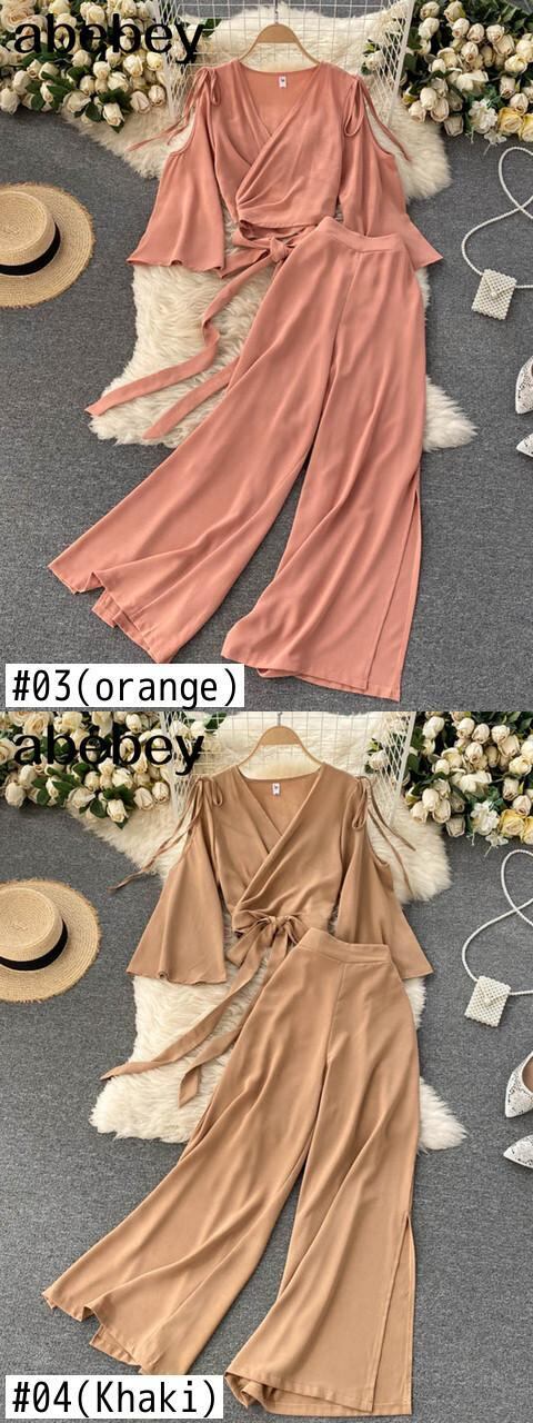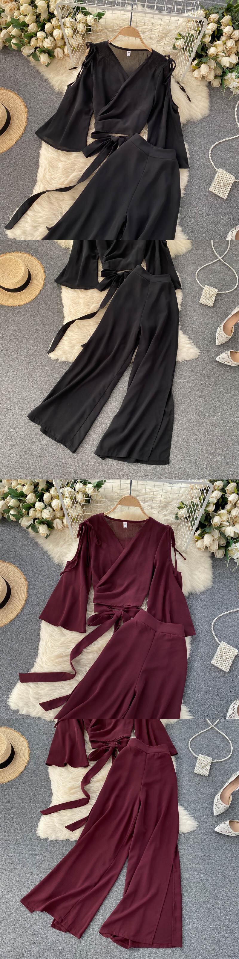 女性の夏のシックなスーツセクシーなオフショルダーシフォンショートトップス + ウエストワイドレッグスプリットロングパンツ 2 点セット サマー 夏物 ワイドパンツ Abe47890606744