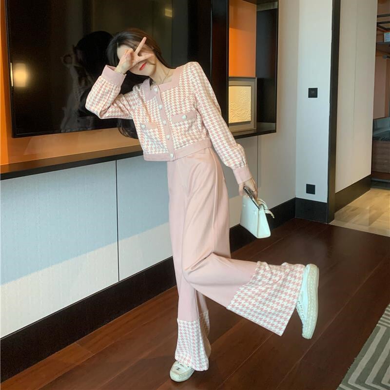 女性ニットカーディガン長袖セーターコート + ワイドレッグパンツセットスクエアカラートップスズボン 2 点セットチェック柄スーツ ロング ワイドパンツ スクウェア Rhc83219333957