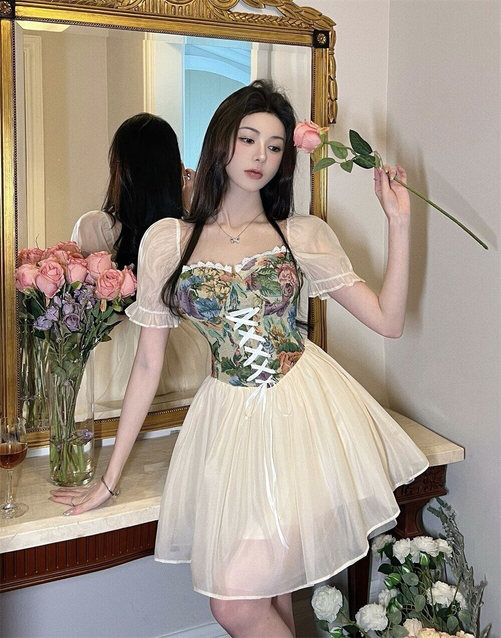 フランスイングランドスタイルのサマードレス女性eseプリントドレス女性パッチワーク包帯フリルドレス ラッフル 夏物 ヨーロピアン Rhc16987366326