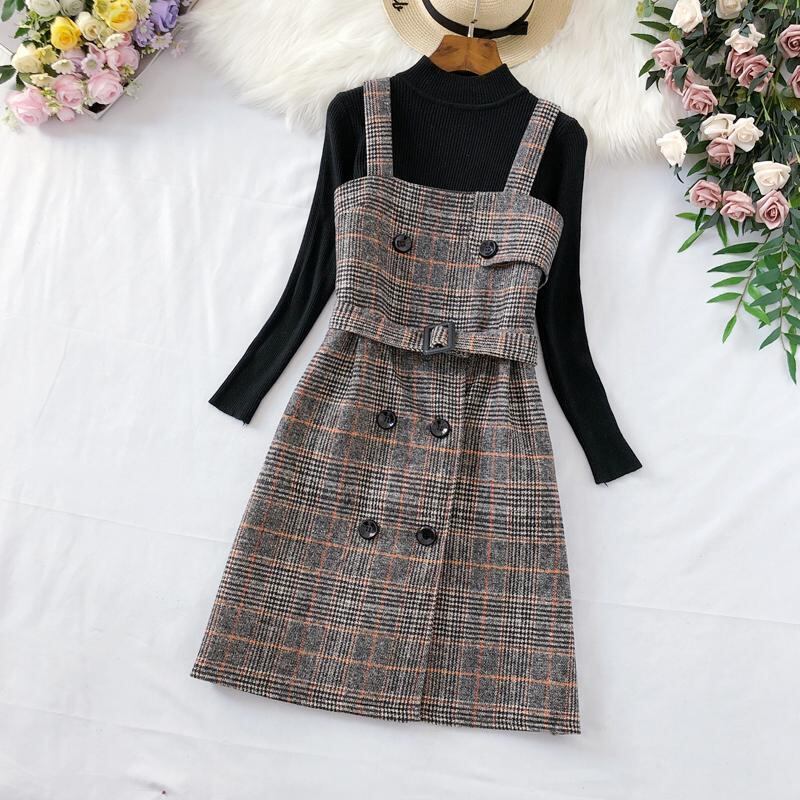 女性ドレス 2020 秋冬ツーピースセットニットセータートップとウールチェック柄ドレス女性オフィスドレスサッシ オータム 秋物 ウィンター 冬物 会社 学校 通勤や通学にも Rhc50510536895