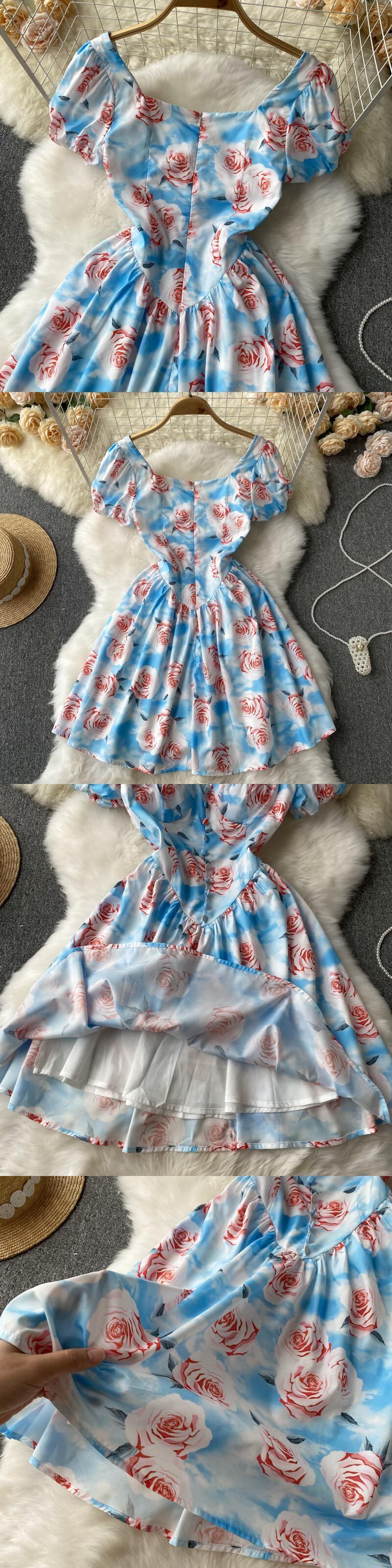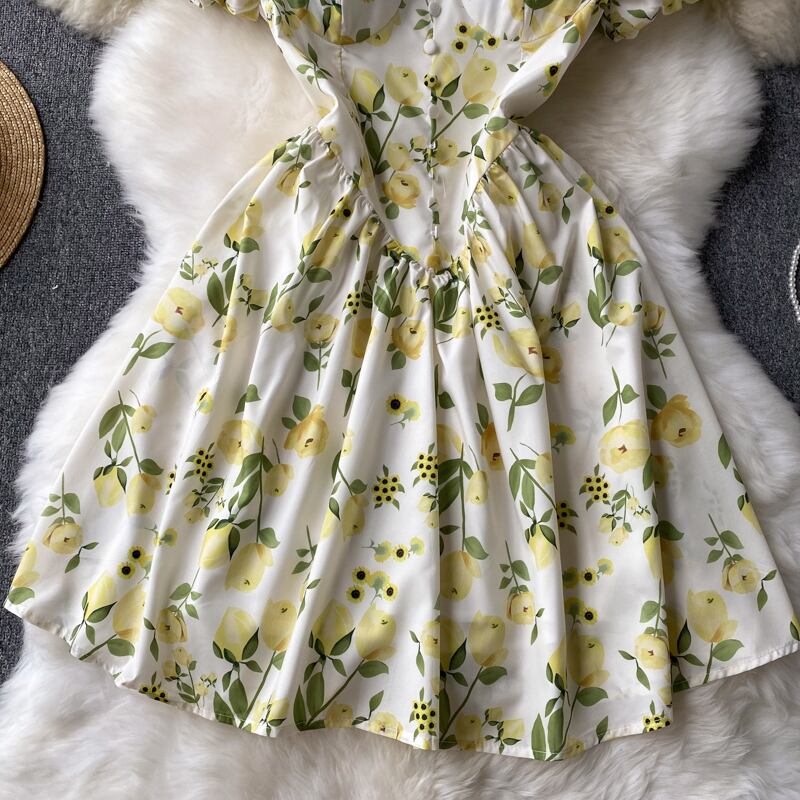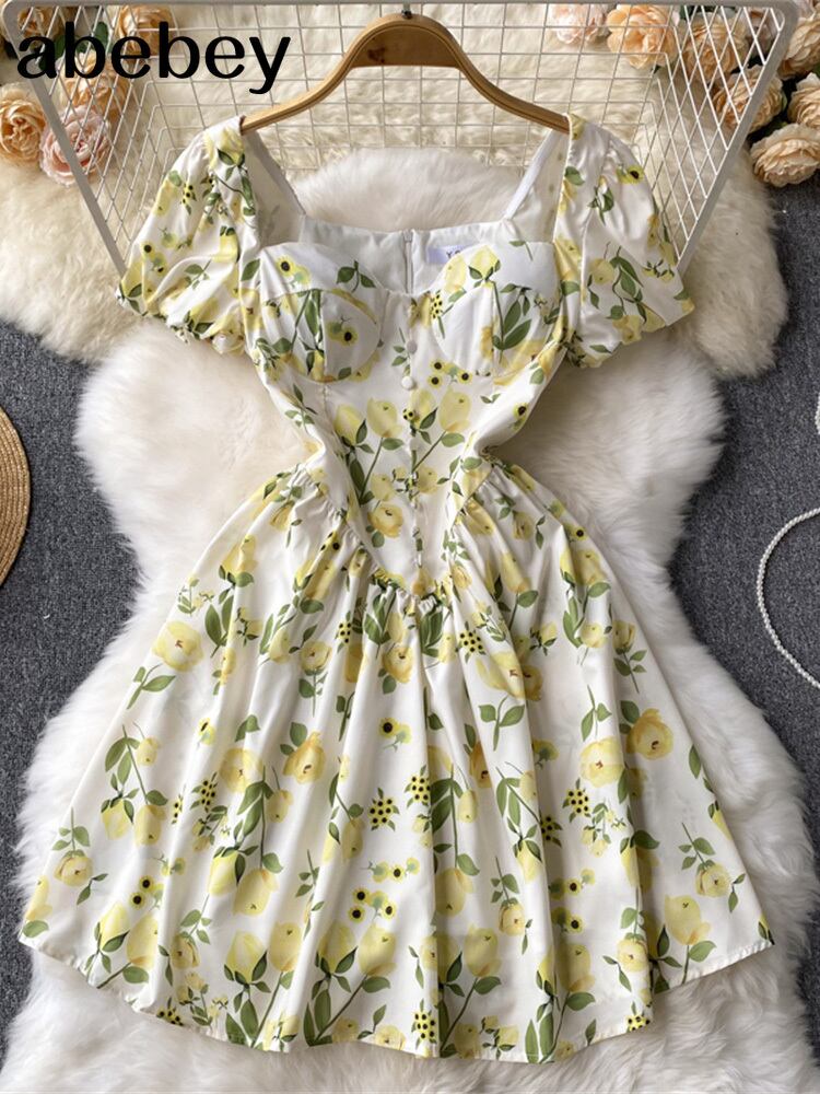 女性フラワープリント恋人ネックラインパディングミニショートドレスフランスシックな夏の花自由奔放に生きる Elbise 大人ガーリー スウィート キュート カジュアル サマー 夏物 花柄 フラワーデザイン Abe20065038292