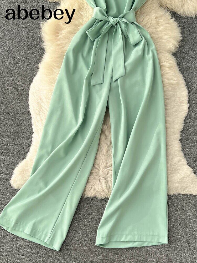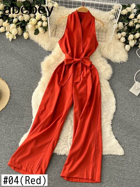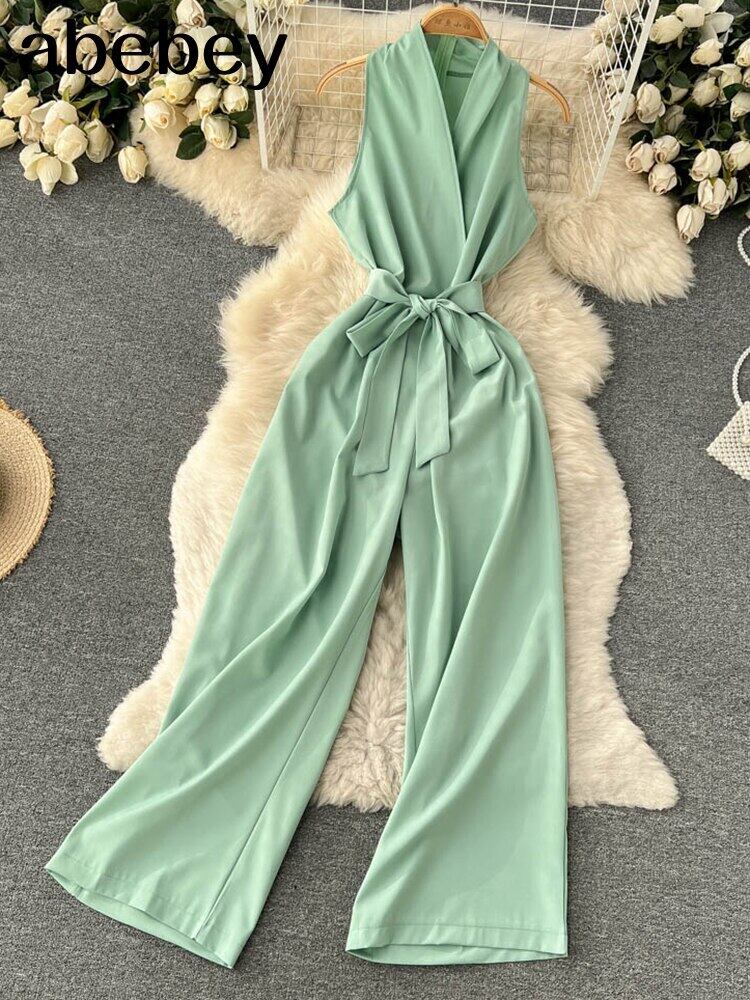 2022 女性サテンジャンプスーツ夏 V 襟ノースリーブ遊び着セクシーなストリート背中の開いたワイド脚ロンパースロング サマー 夏物 ワイドレッグ ワイドパンツ Abe76260986241