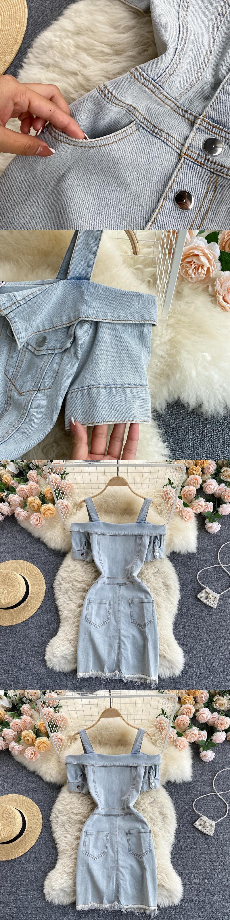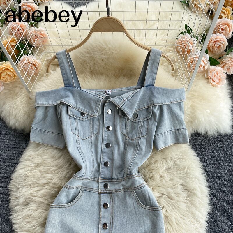 女性デニムストラップドレスソリッドスリムペンシルドレス夏セクシーなオフショルダーストリートショートドレス サマー 夏物 ソリッドカラー Abe74063080464