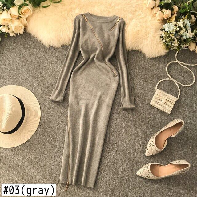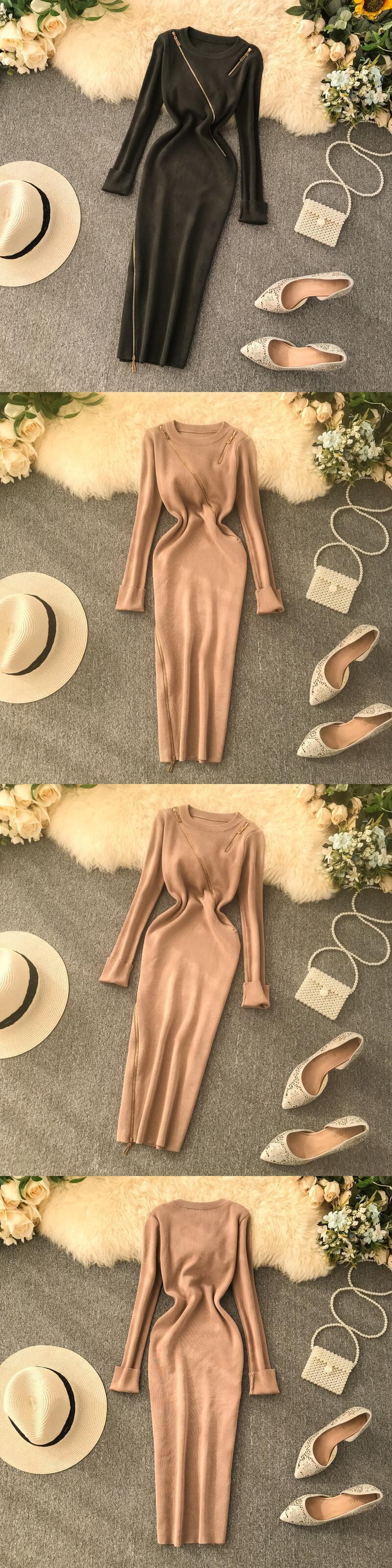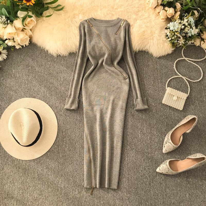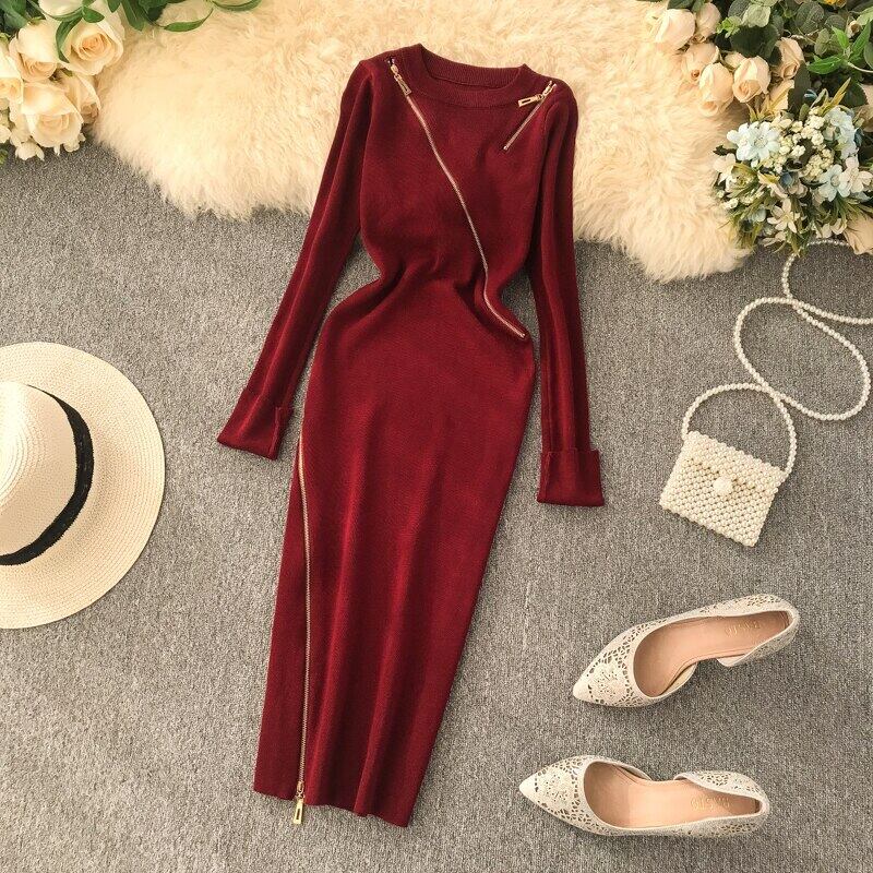 スリム 2022 ジッパー秋ドレス冬ボディコンニットセーターミディペンシルドレスパーティー膝丈女性オフィス Vestidos オータム 秋物 ウィンター 冬物 会社 学校 通勤や通学にも Abe61635183994
