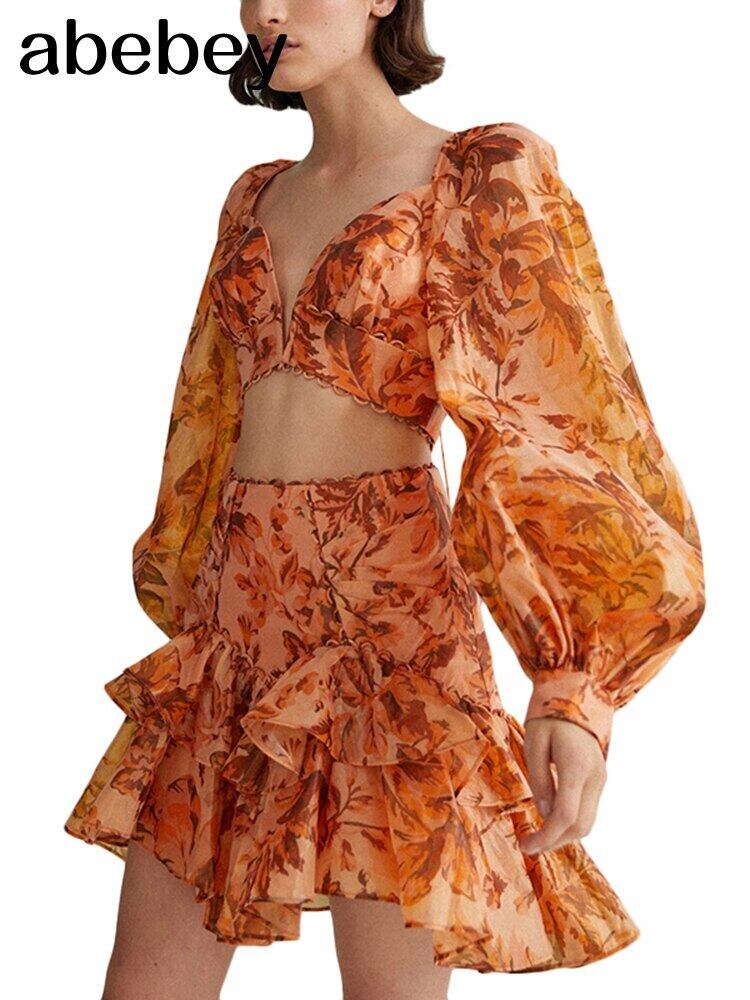 プリント女性ツーピースセット V ネックランタン長袖ショートトップウエストパッチワークフリルスーツ ロング ラッフル Vネック Abe43716287815