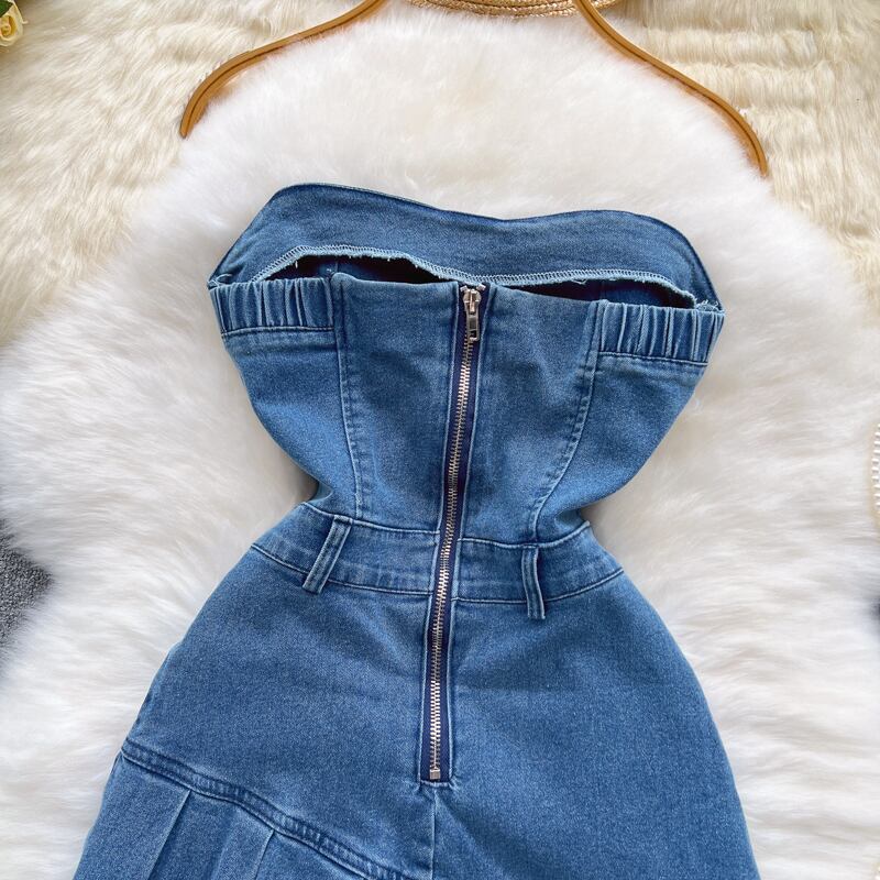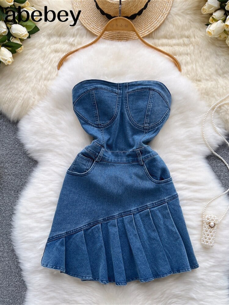 女性デニムミニドレスオフショルダーストラップレスノースリーブサスペンダードレス夏 Y2k パーティー A ライン Frocks サマー 夏物 Aライン Abe30841596622