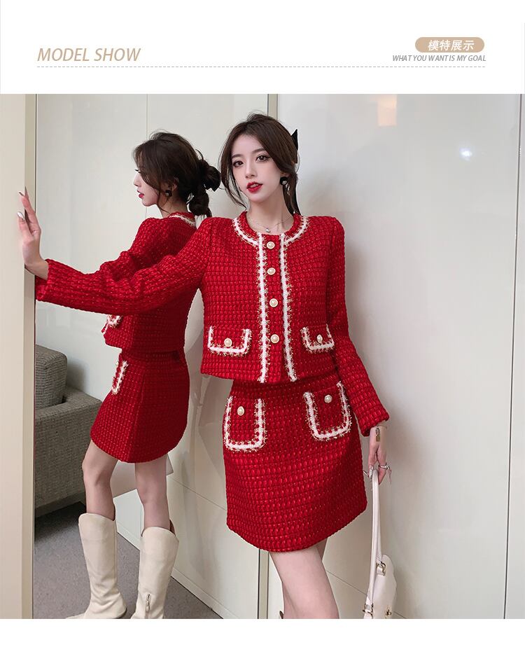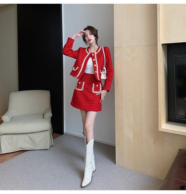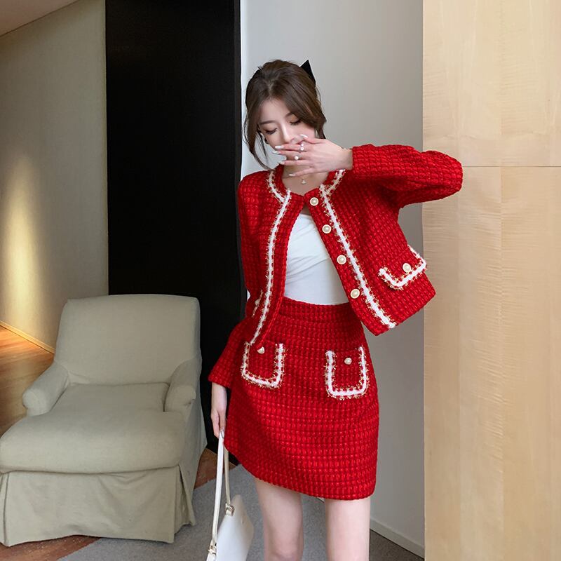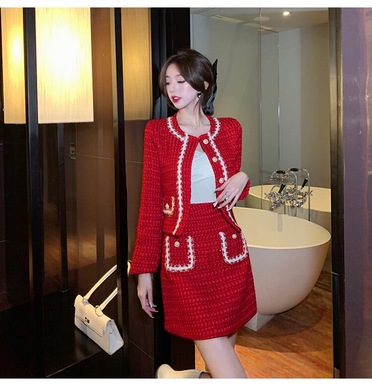 小さな香りの冬の女性ウールツイード厚い 2 点セットパールカーディガンフリンジ付きジャケットコート + ポケットミニスカートスーツ ウィンター 冬物 真珠 Rhc69727398109