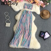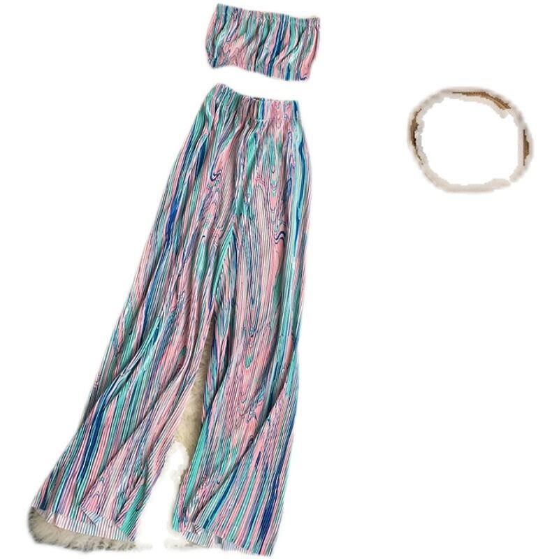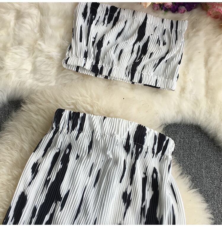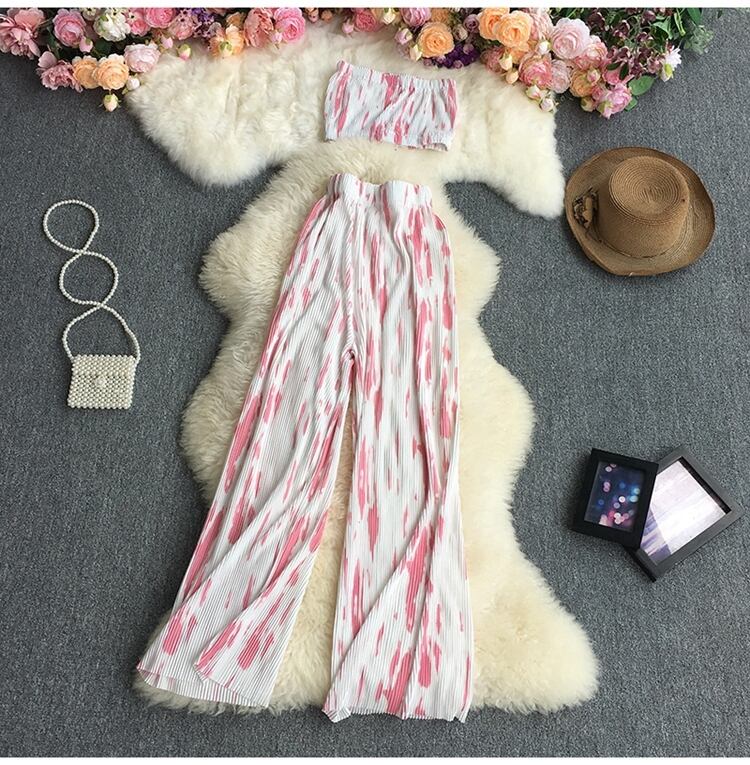 2022年夏 ノースリーブ ショート プリント ストラップレス トップス + ハイウエスト カジュアル プリント ワイドレッグ パンツ 2点セット ハイウェスト サマー 夏物 ワイドパンツ Abe14524284734