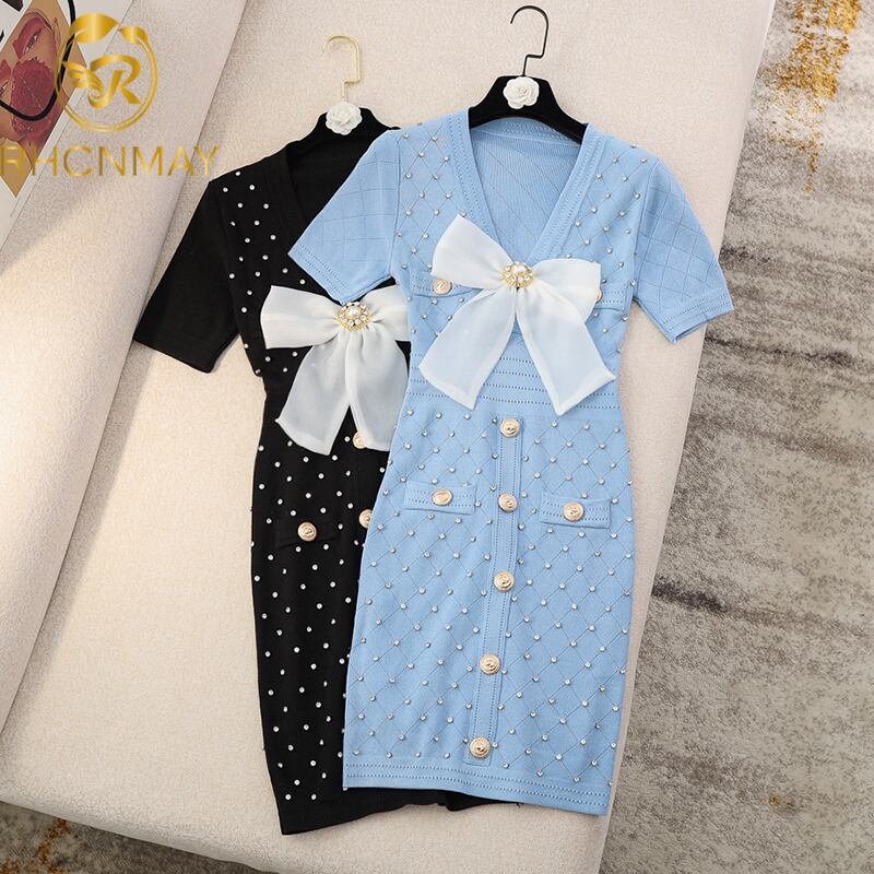 V ネック夏秋の女性ドレス ビーズ弓ボタン半袖シックなパーティー ニット ドレス Vestidos ショート リボン ハーフスリーブ サマー 夏物 オータム 秋物 Vネック Rhc3099643334