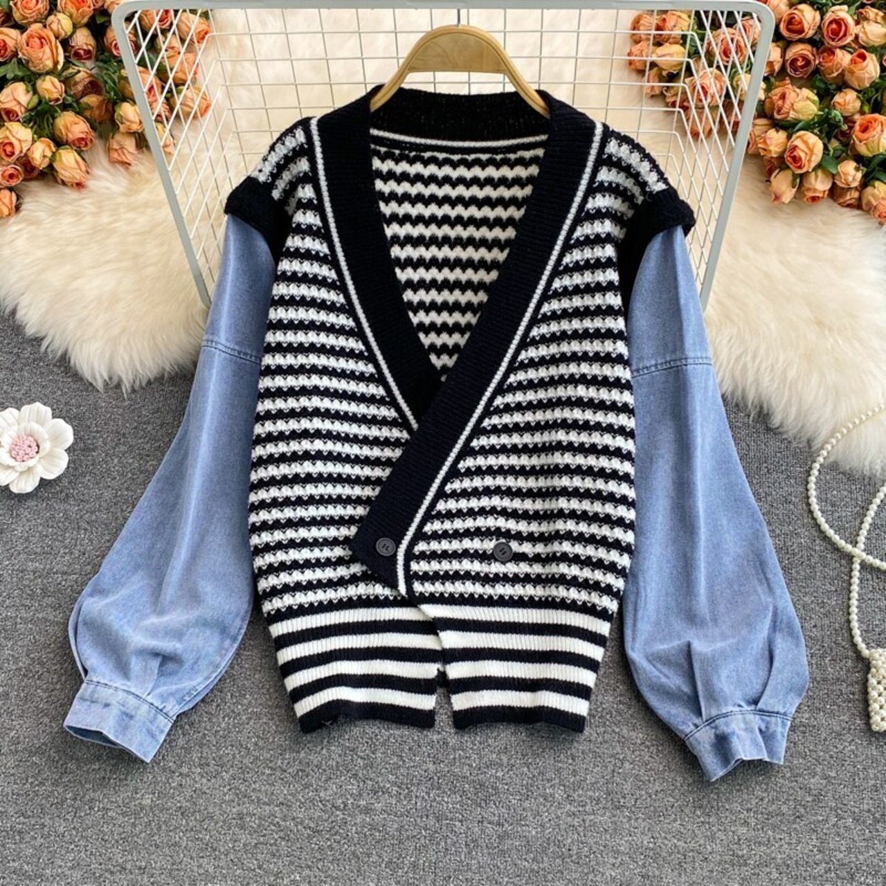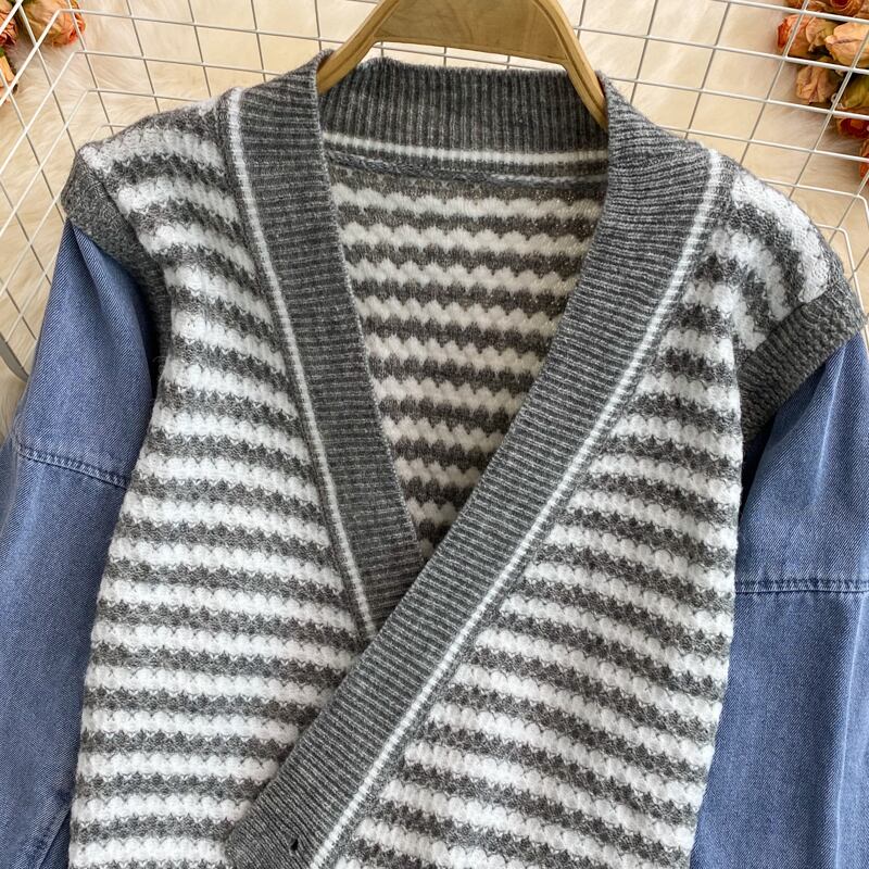 2021年秋フィーリングスプライシングカウボーイ偽二ニットベストカーディガンコート長袖ストライプセーター ロング オータム 秋物 Rhc70476317836