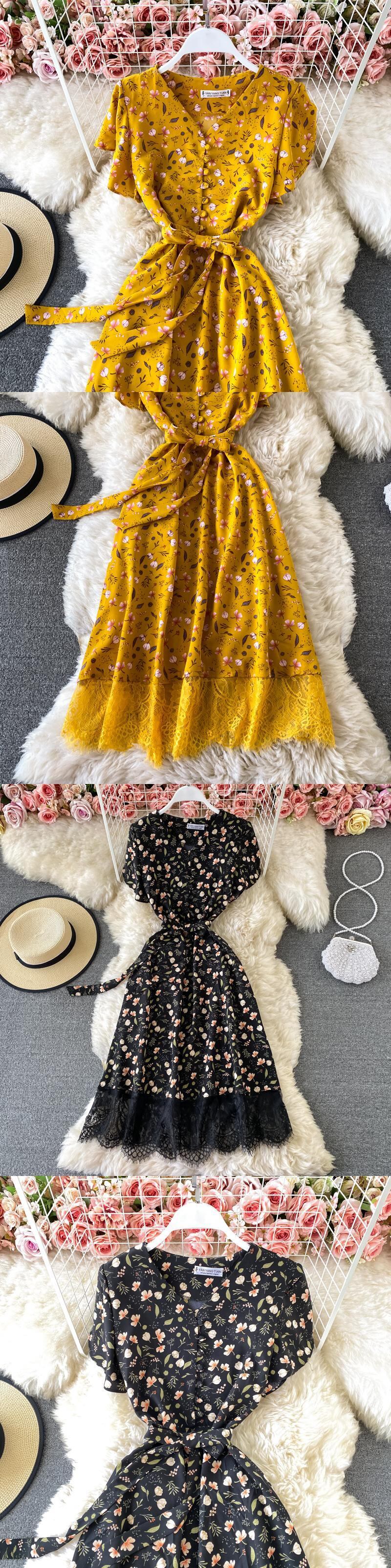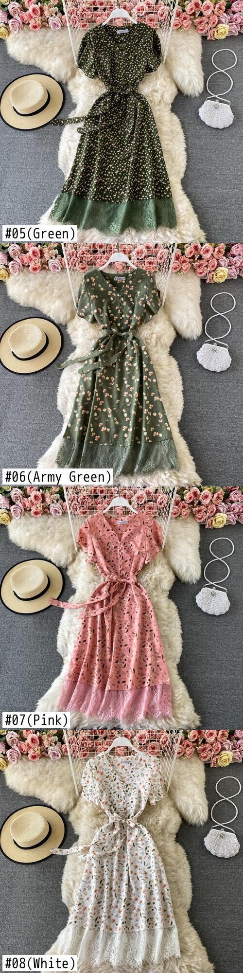 夏の女性の花プリントレースパッチワークミディドレス V ネック半袖ウエストシフォン Vestidos 2022 ショート ハーフスリーブ サマー 夏物 花柄 Vネック Abe60430335684