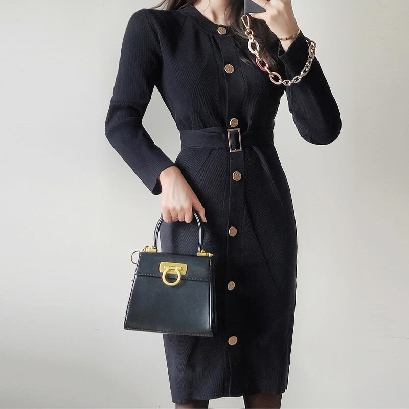 女性ニットカーディガンドレス秋冬ミディアム丈のセータードレス無地 O ネックシングルブレスト小帯ドレス オータム 秋物 ウィンター 冬物 Oネック ソリッドカラー Rhc97501211222