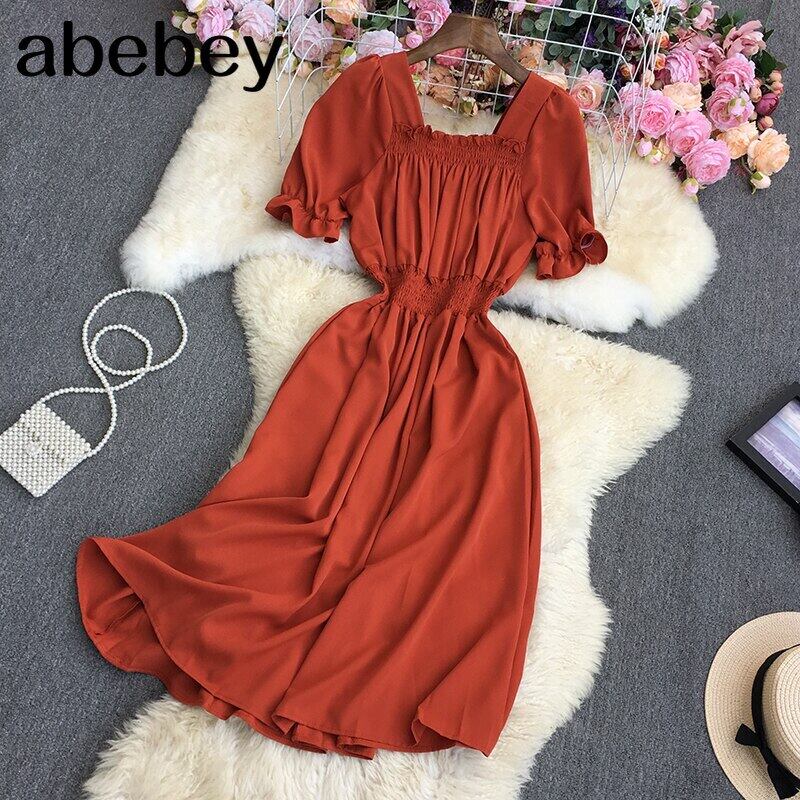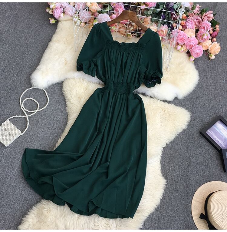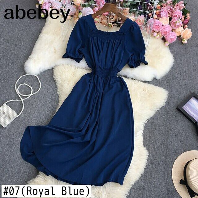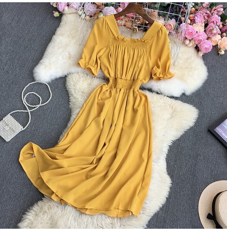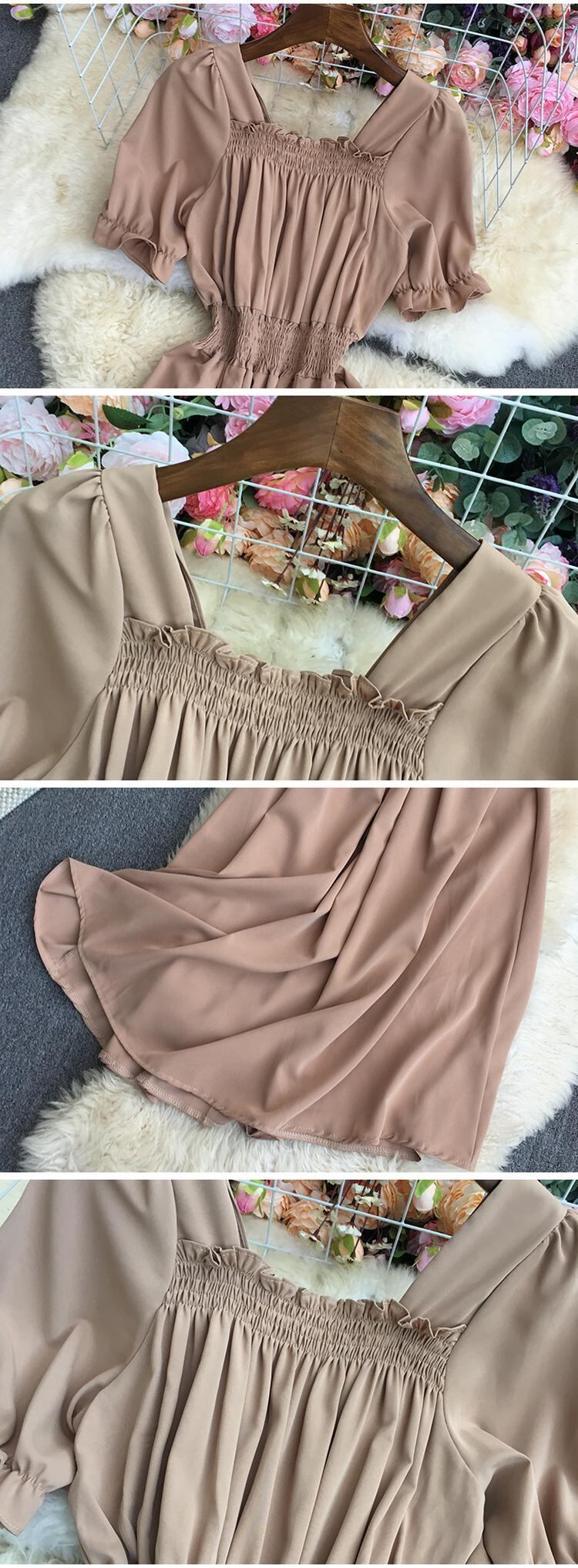 2022春秋スクエアカラー半袖ドレステングタケエッジハイウエストプリーツ無地ミッドレングスAラインドレス ハイウェスト ショート ハーフスリーブ スプリング 春物 オータム 秋物 ソリッドカラー スクウェア Abe7306006144