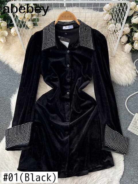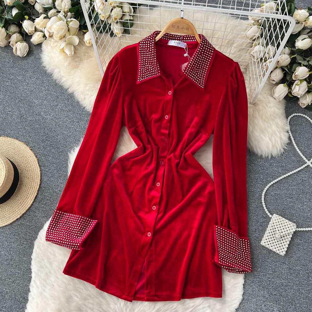 秋の女性グリーン/ブラック/レッドダイヤモンドベルベットミニドレスターンダウン襟シングルブレストウエストパーティー Vestidos オータム 秋物 Abe37927886473