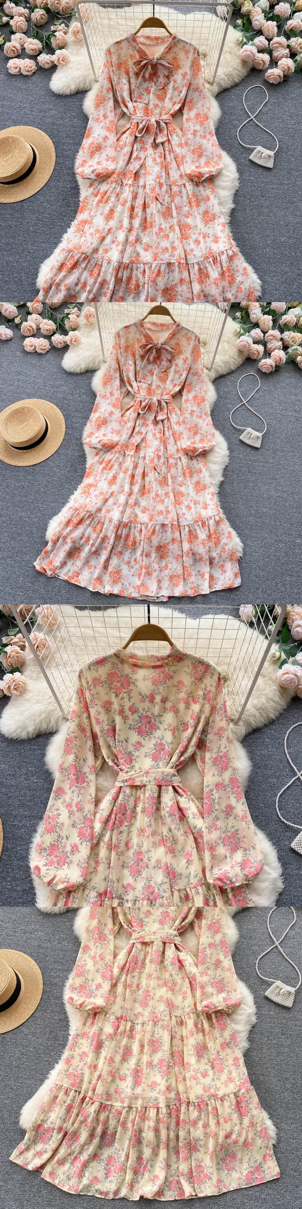 セクシーな弓の襟自由奔放に生きるランタン長袖ビーチドレスプリントシフォンレトロドレスレースアップパーティーマキシロングドレス リボン Abe57592274092