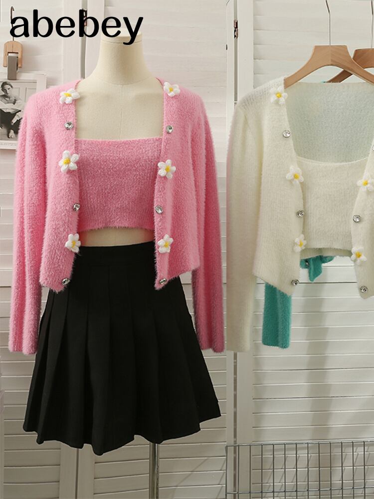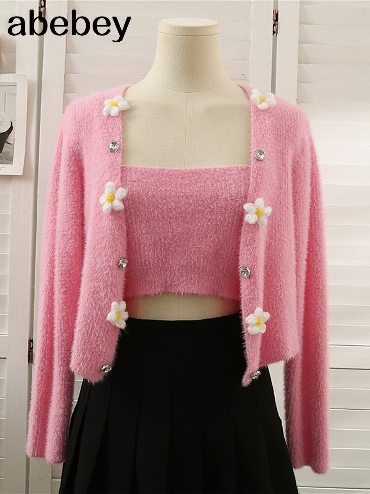 スタイルツーピースセットカーディガン女性のセクシーな秋キャンディカラー長袖リブニットクロップドセーターとマッチングベスト ロング オータム 秋物 Abe11232344491