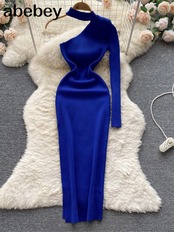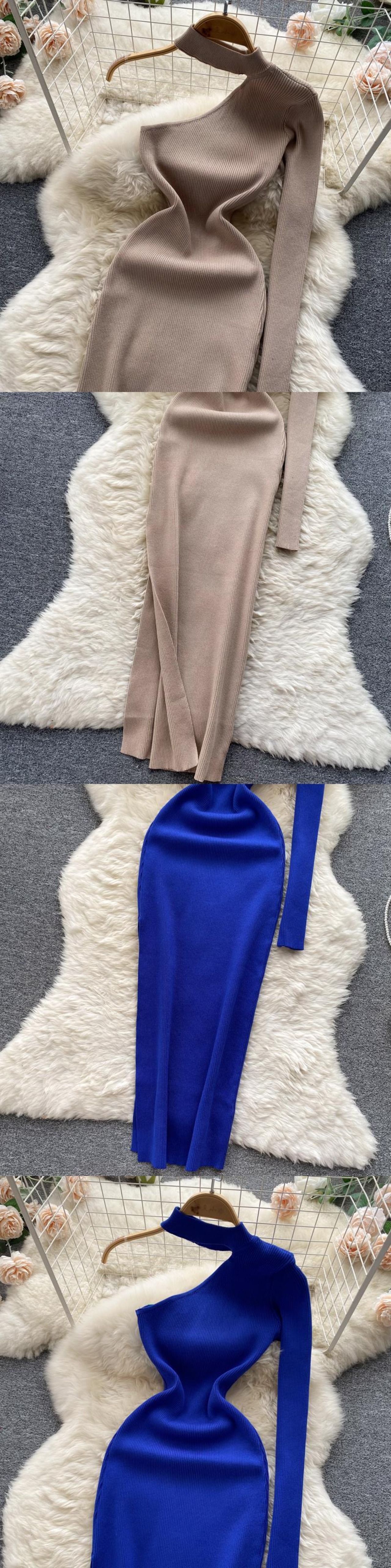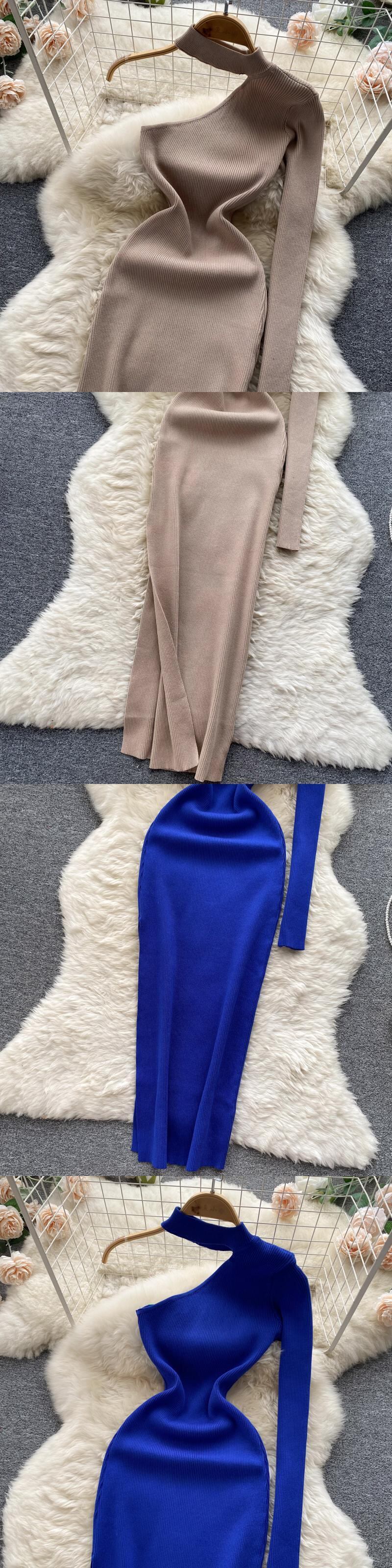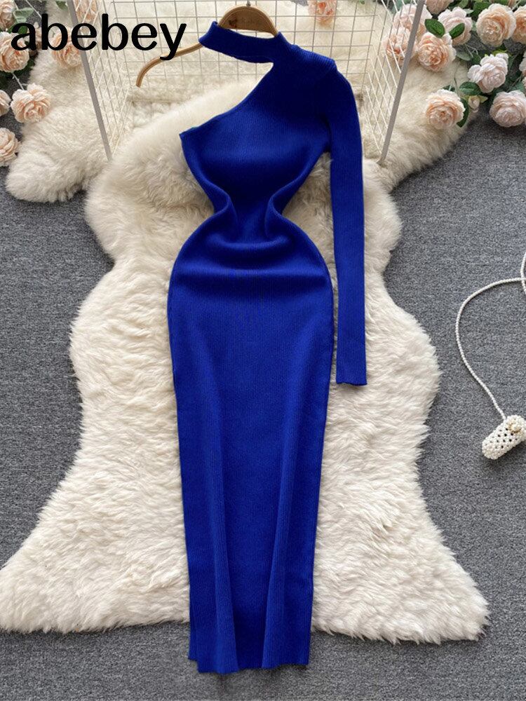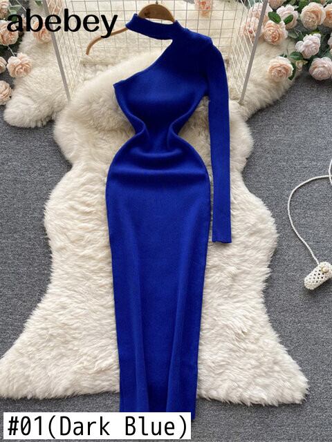 女性ワンショルダーニットペンシルドレス長袖弾性スリムドレス秋冬セクシーなボディコン暖かいセータードレス ロング エラスティック 伸縮 オータム 秋物 ウィンター 冬物 Abe17822983323