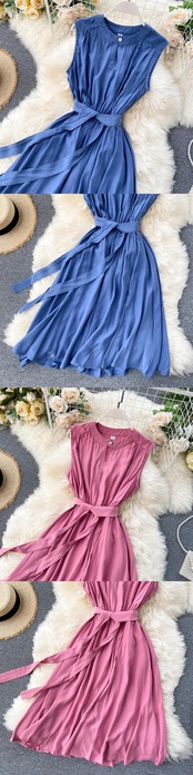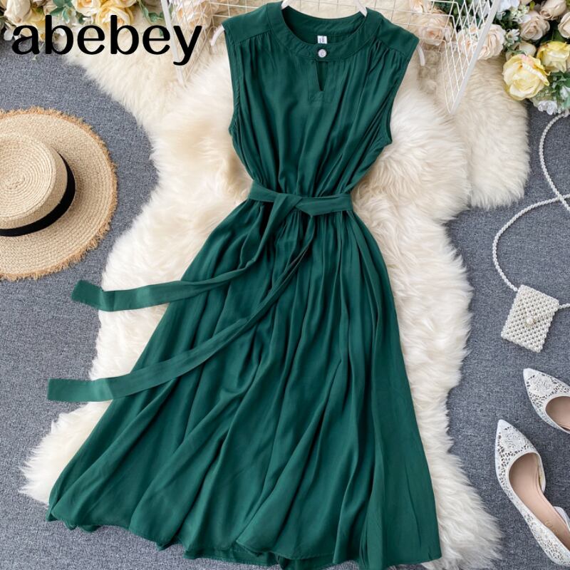 夏の無地グリーン/ブルー/イエロー ドレス ノースリーブ ラウンド ネック サッシュ ドレス 2022 Vestido Verano サマー 夏物 Oネック ソリッドカラー Abe34979406875