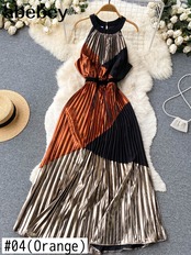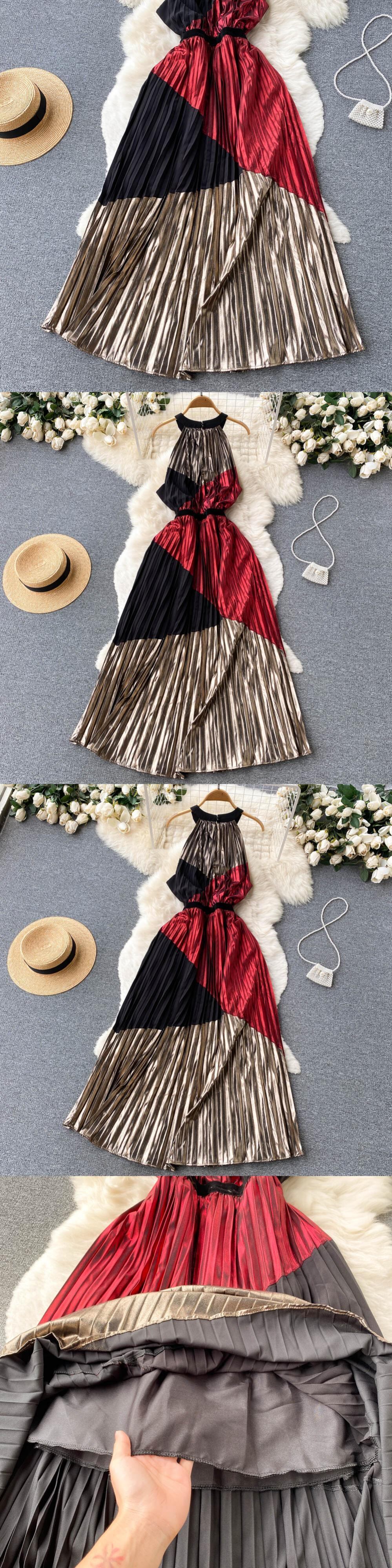 夏の女性ホルターパッチワークプリーツロングドレスセクシーなノースリーブウエスト A ラインパーティードレープマキシ Vestidos サマー 夏物 Aライン Abe91803284494