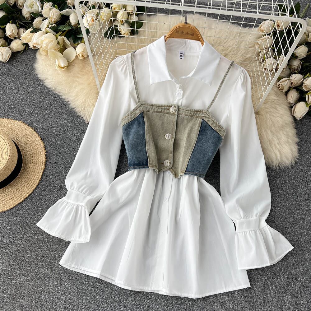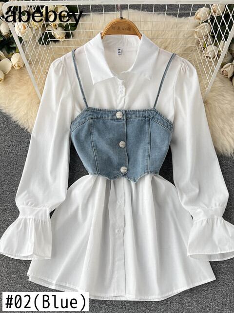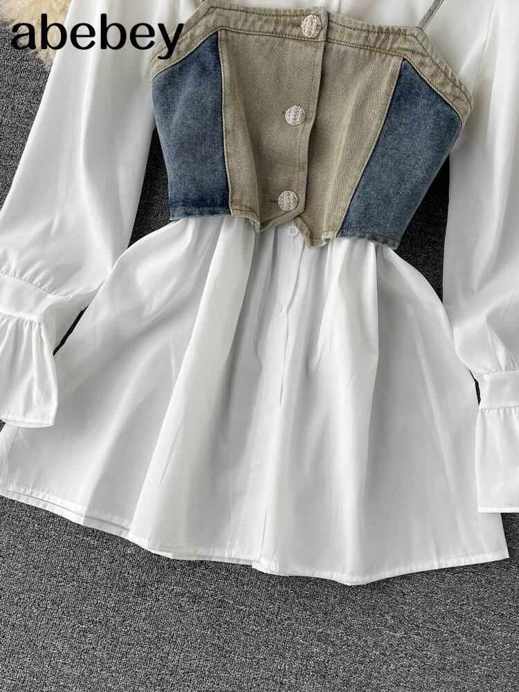 秋のドレス二枚スーツラフスリーブ白シャツドレス + ミニデニムキャミソールスーツ女性ストリートスリムセット ホワイト オータム 秋物 Abe34885482267