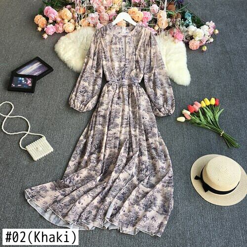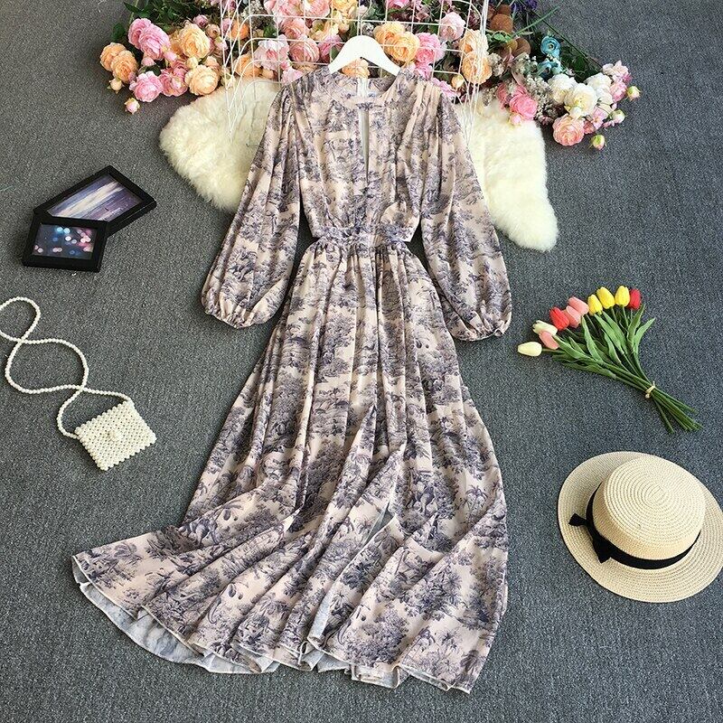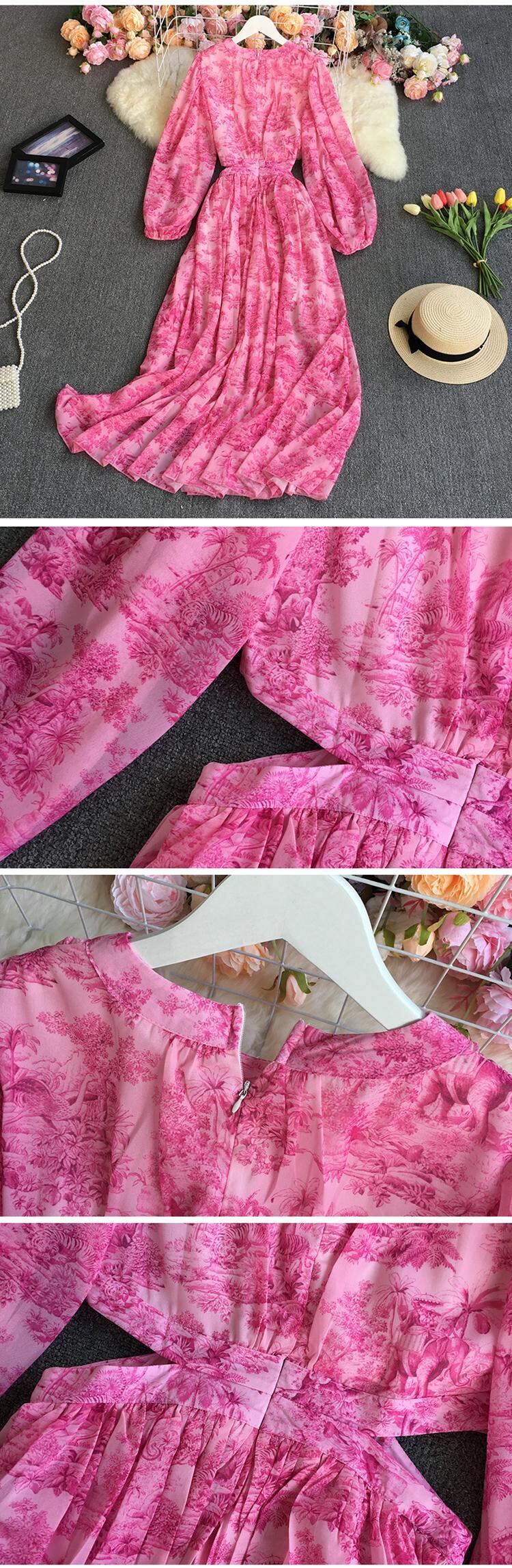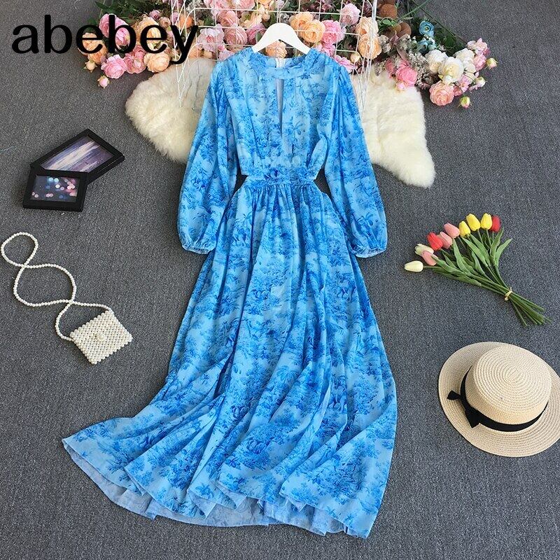 2022 春秋 O ネック長袖ドレス中空アウトデザインハイウエストプリーツプリントロング A ラインビッグスカートドレス ハイウェスト スプリング 春物 オータム 秋物 Oネック Aライン Abe92011054363