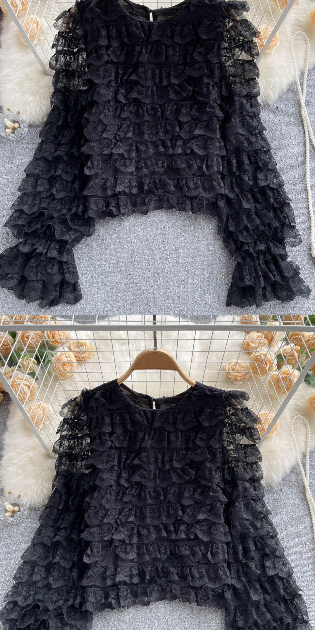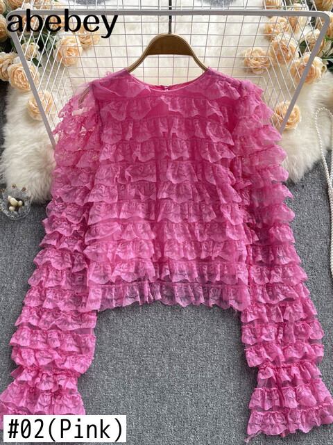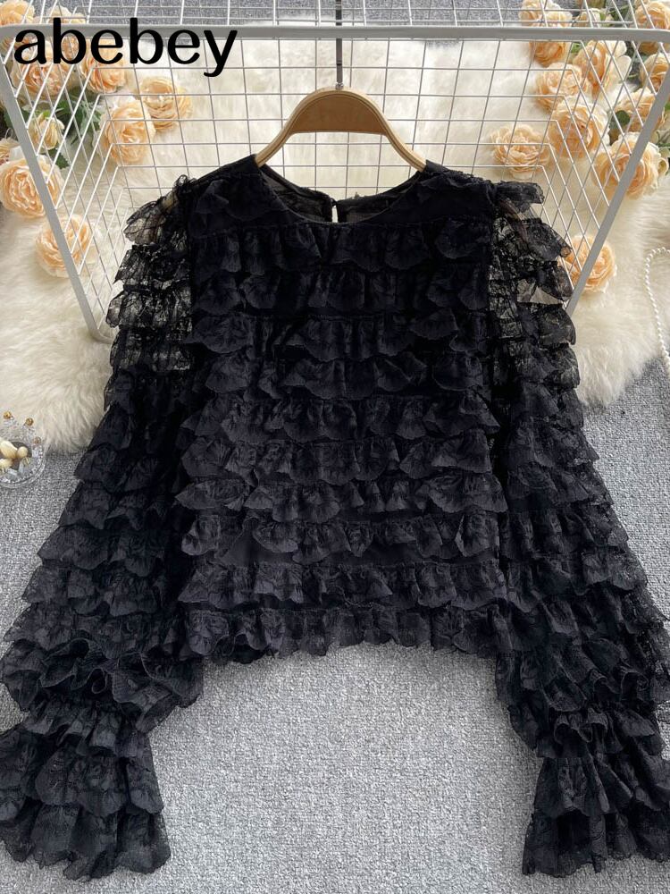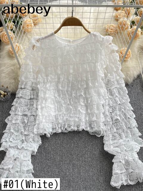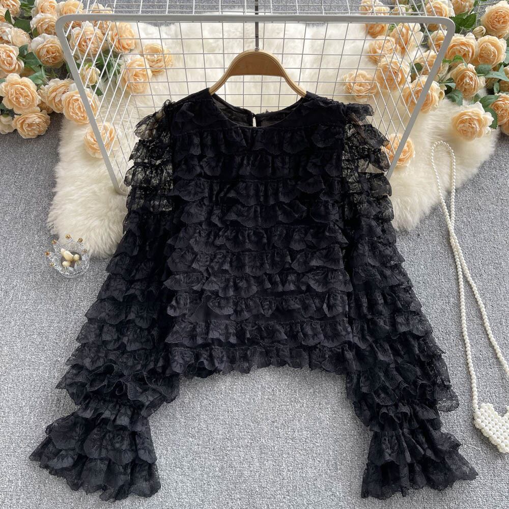秋の休暇スタイルフリルレースワークシャツ O ネック長袖ブラウス 2022 ルーズ女性シフォントップス ロング オータム 秋物 Oネック Abe29623465241