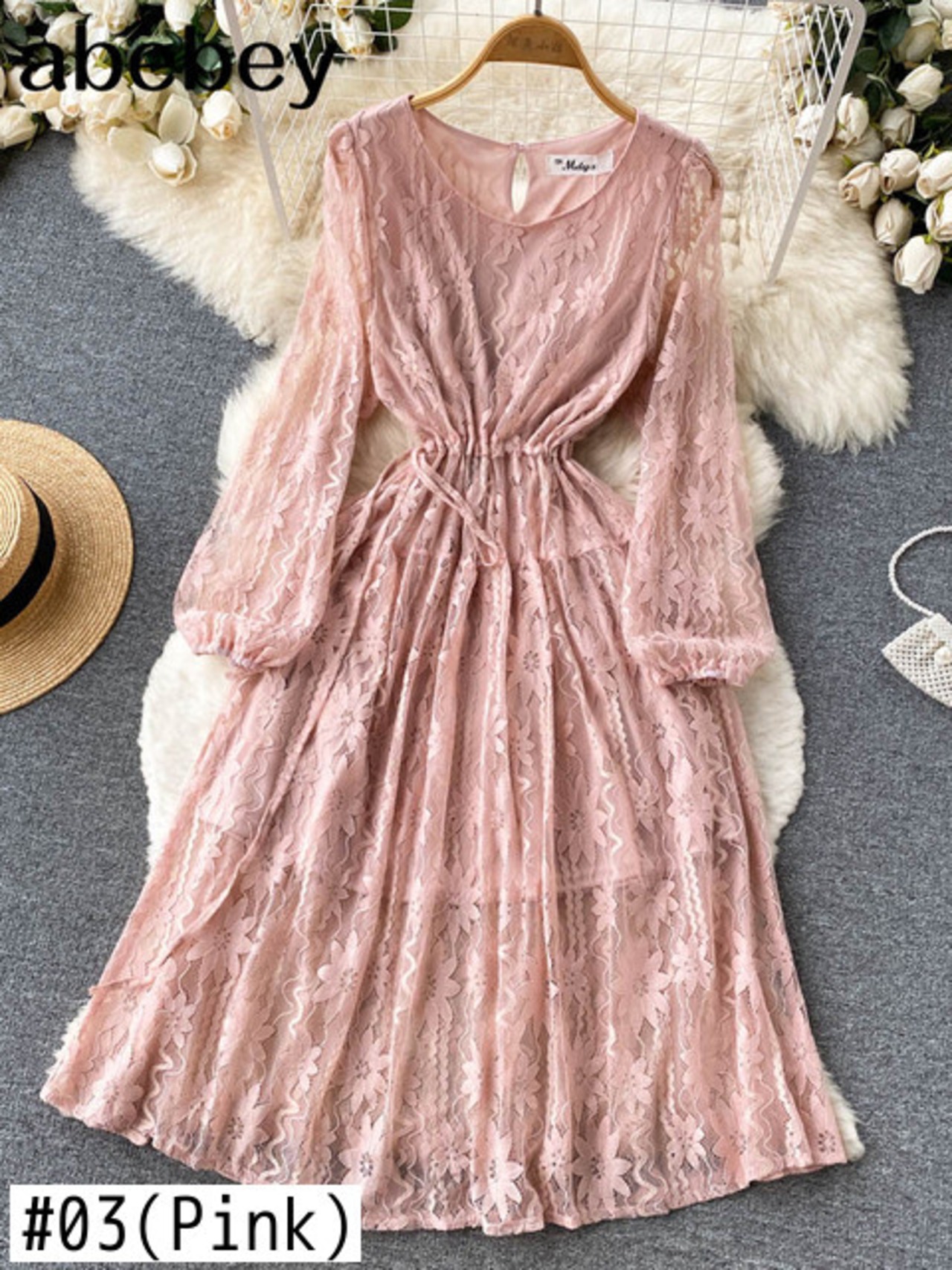 秋の女性ブラック/ホワイト/ピンク/ベージュ巾着レースミディドレス O ネックパフ長袖 A ライン甘い Vestidos ロング 大人ガーリー スウィート キュート カジュアル オータム 秋物 Oネック Aライン Abe67944998461