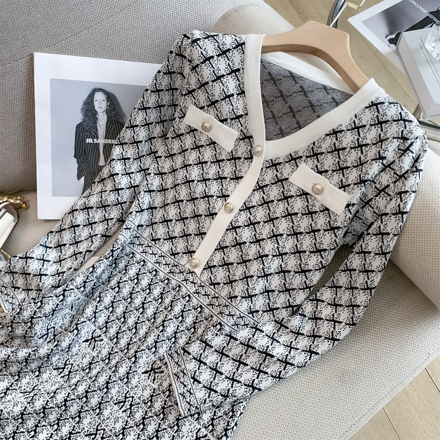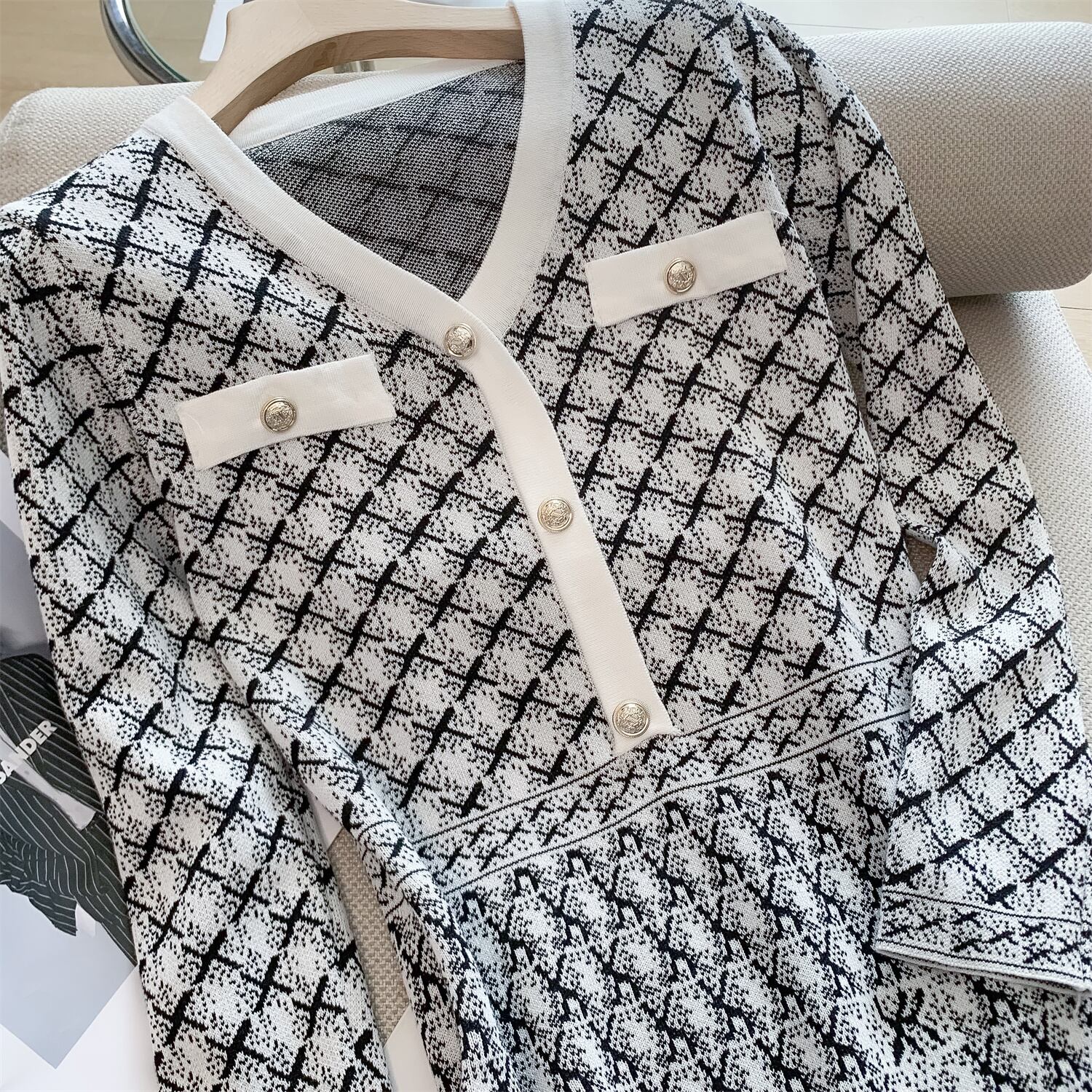 高級 V ネック ジャカード ニット ミニ ドレス スリム フィット A ライン女性秋冬 2022 オータム 秋物 ウィンター 冬物 Vネック Aライン Rhc12004049259