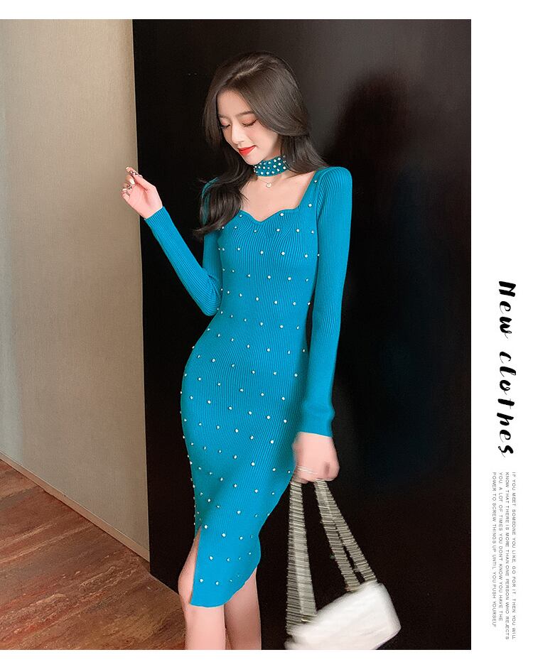 スクエアネックの女性のスリムニットドレス 2022 秋のボディコンスプリットオーバーニーセータードレス女の子のお尻底ニットドレス オータム 秋物 スクウェア Rhc75684712696