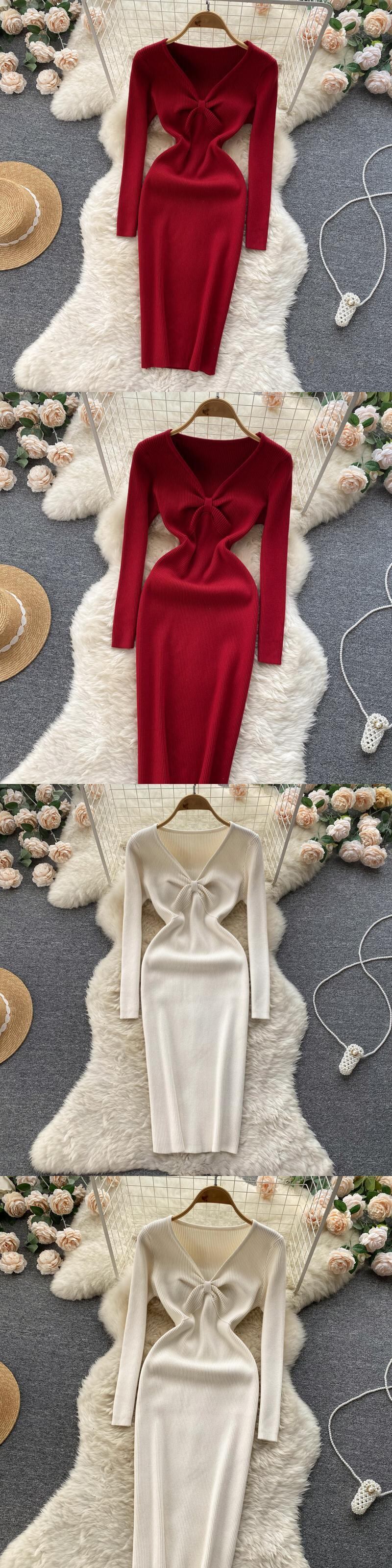 2022 女性ニットペンシルドレス長袖 V ネック弾性スリムドレス秋冬セクシーなボディコン暖かいセータードレス ロング エラスティック 伸縮 オータム 秋物 ウィンター 冬物 Vネック Abe91654926752