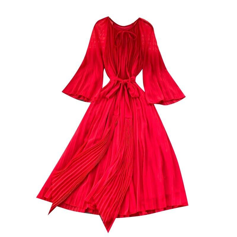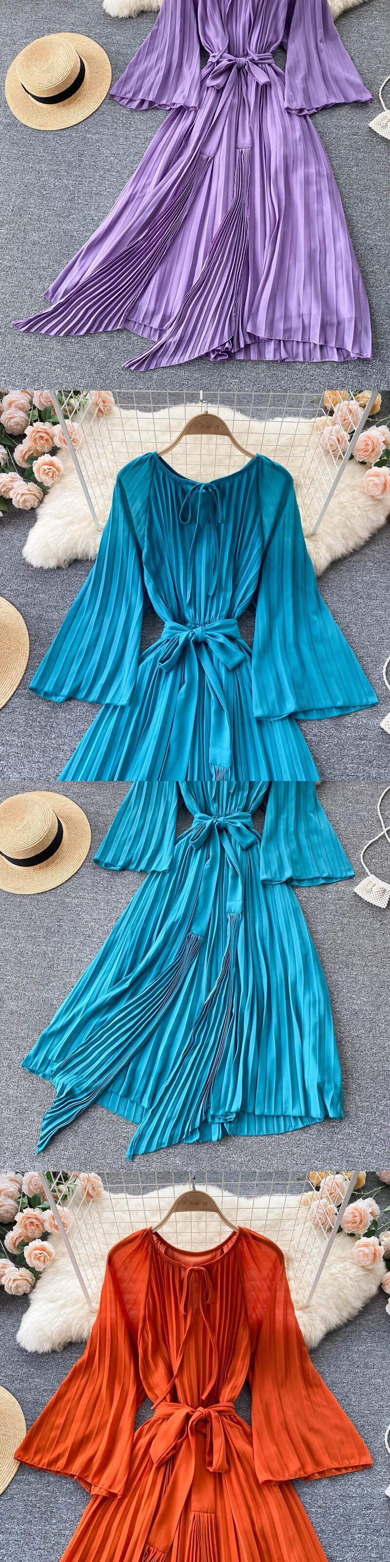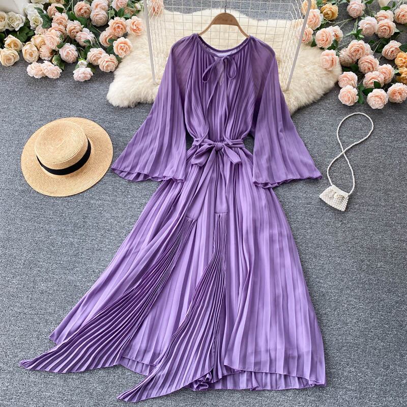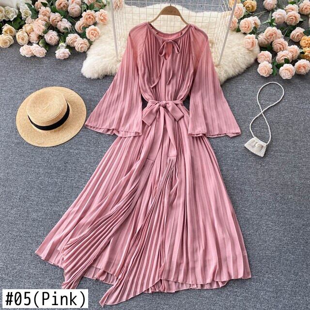 2022 秋プリーツドレス女性長袖サッシ A ラインドレスストリート秋ロングドレス オータム 秋物 Aライン Abe165214642