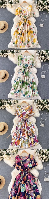 緑の夏の女性のドレス ボヘミアン花プリント ホリデー ローブ Vestidos O ネック半袖ミディ サンドレス ショート ハーフスリーブ サマー 夏物 花柄 Oネック グリーン Abe79321652697