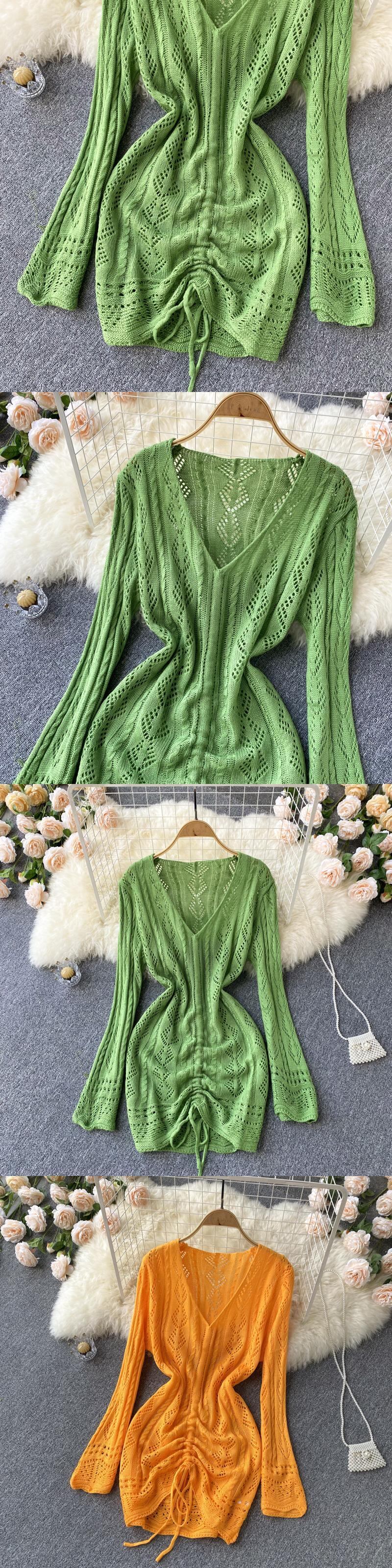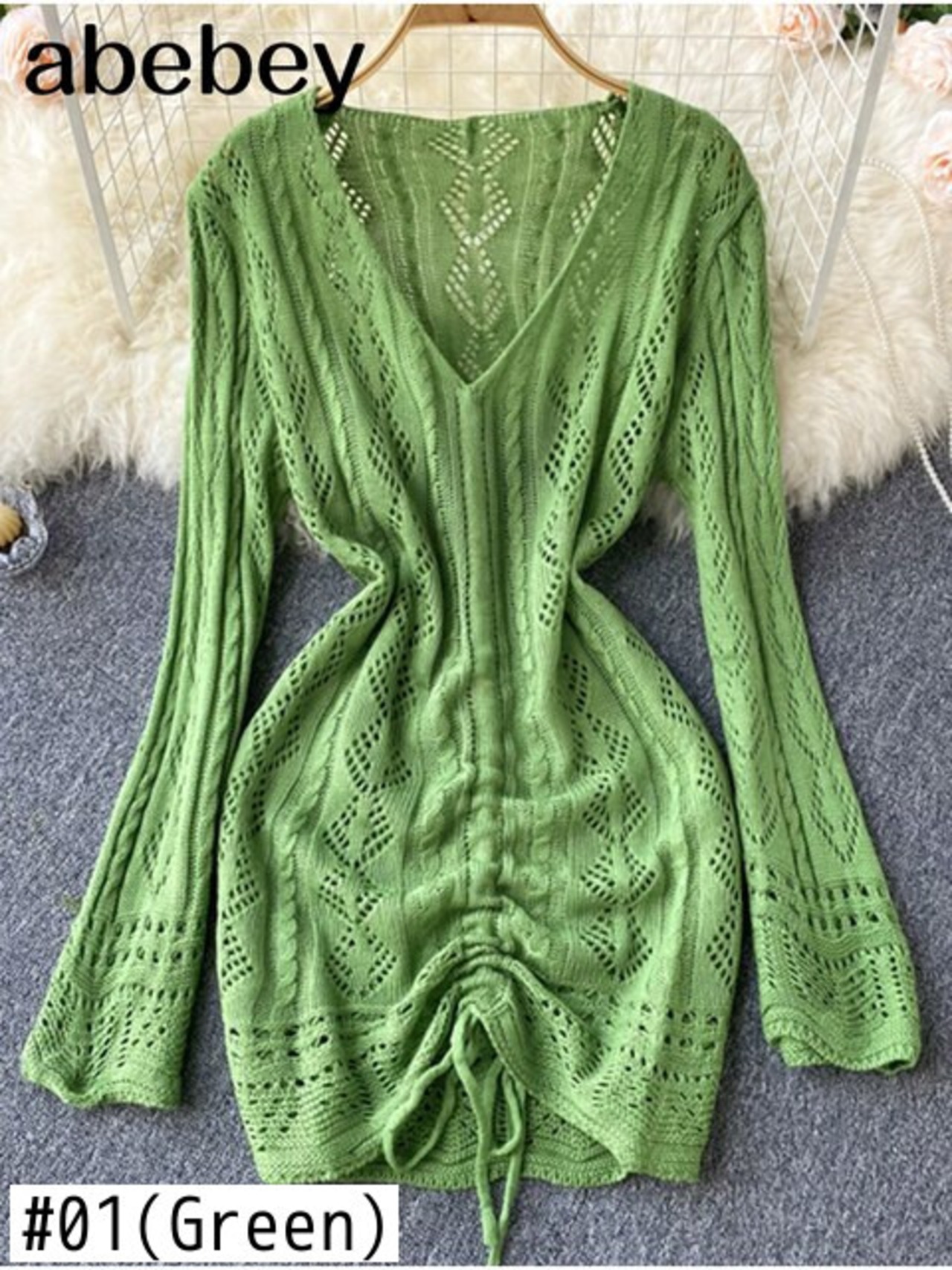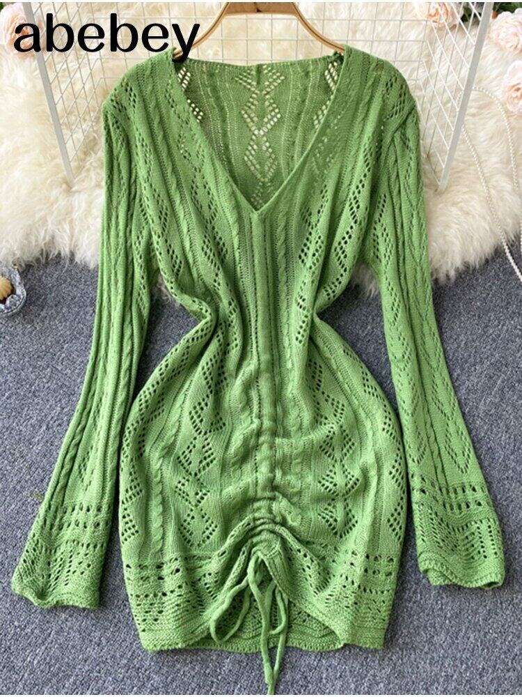 長袖ニットミニドレス女性 2022 春セクシーなボディコンカットアウトパーティークラブタイトショートドレス黒 ロング ブラック スプリング 春物 Abe65323676196