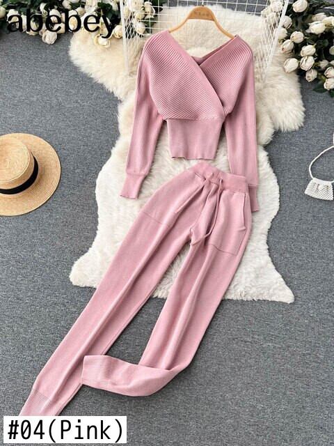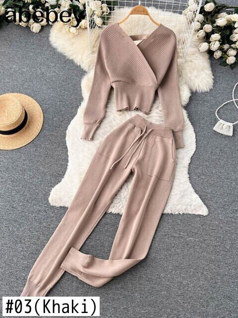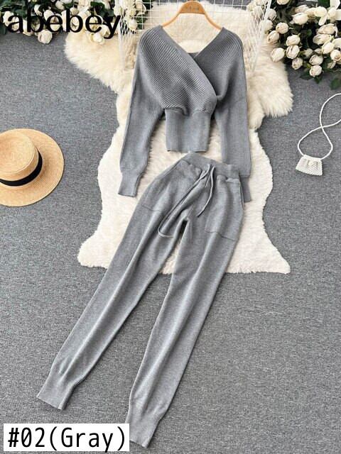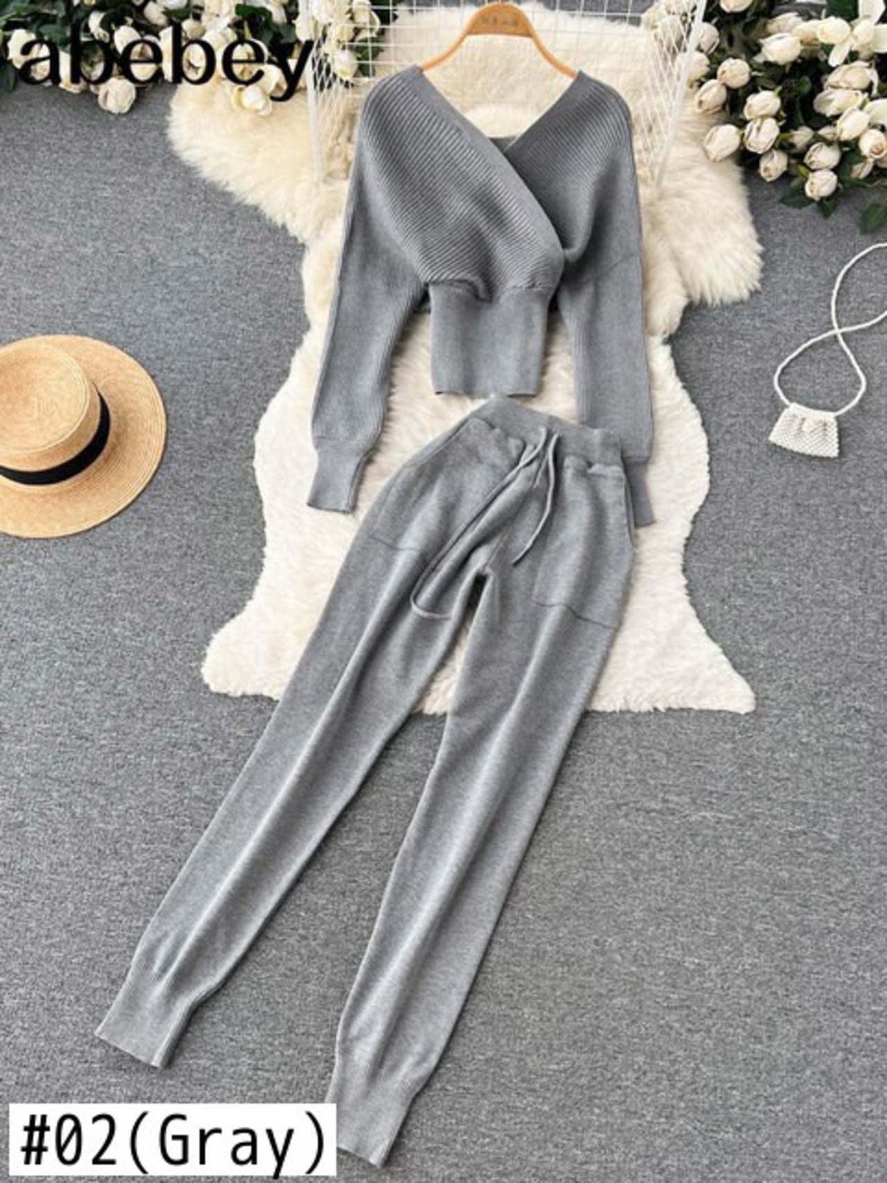 女性の秋のツーピースセット V ネック Blackless プルオーバーセータートラックスーツウエストニットストレートパンツスーツ春服 ブラック スプリング 春物 オータム 秋物 Vネック Abe42400000183