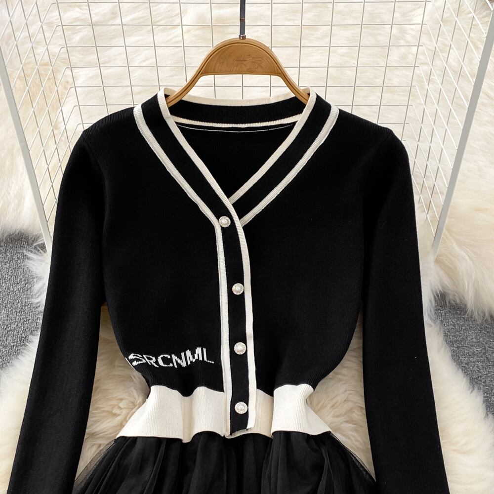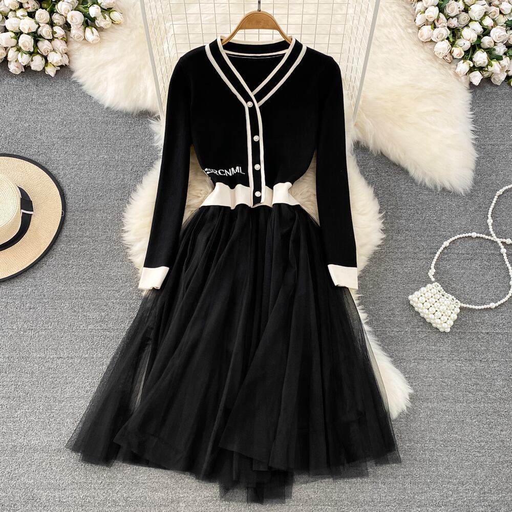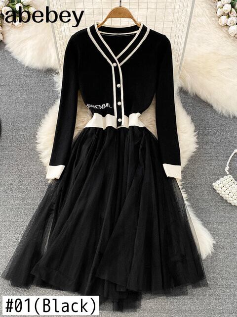 黒人女性ニットロングドレスメッシュ冬 2022 プリーツ A ラインミディドレス V ネックリブローブ ブラック ウィンター 冬物 Vネック Aライン Abe97077370318