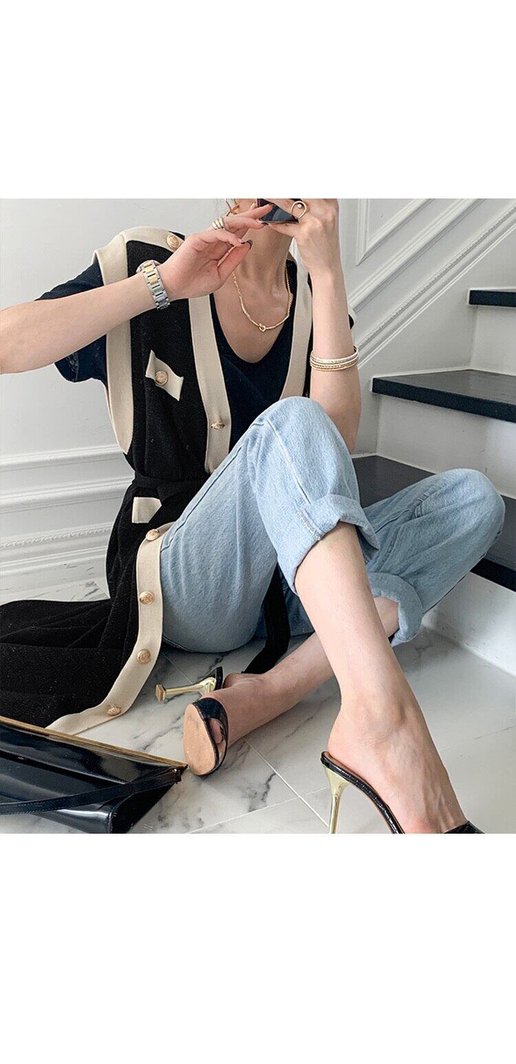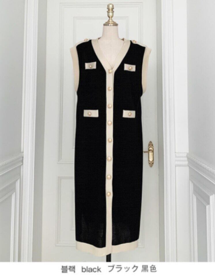 女性のドレス ボタン V ネック 2021 夏ノースリーブ コントレース カラー シングル ブレスト サッシ ニット ドレス サマー 夏物 Vネック Rhc11770820623