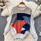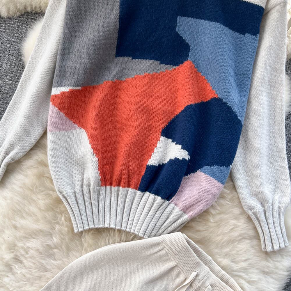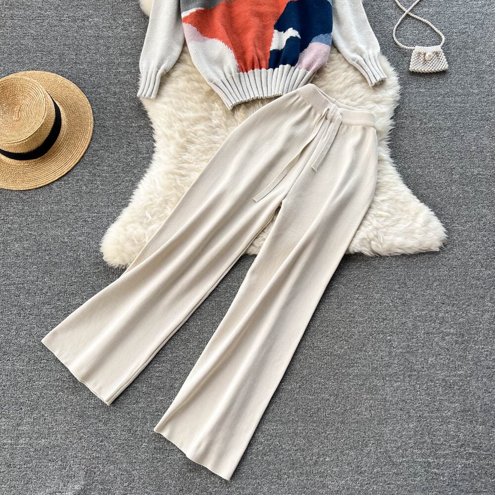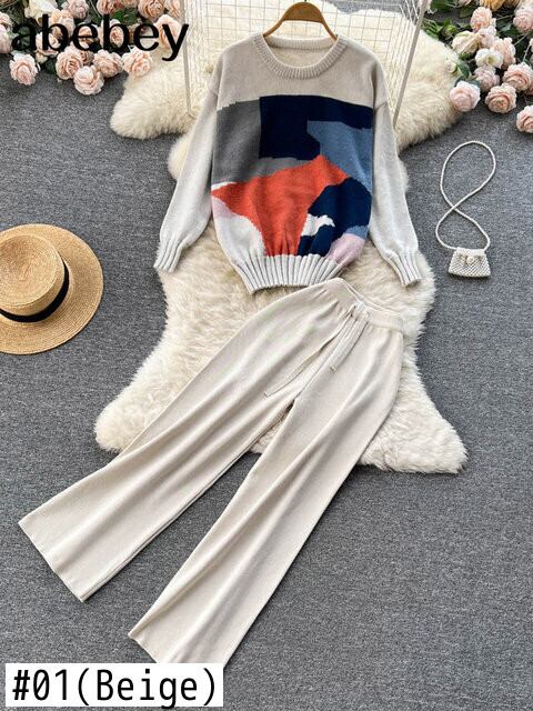 女性の長袖ニット絵画プルオーバー セーター + 弾性ウエスト パンツ セット ズボン 2 枚の衣装 ロング エラスティック 伸縮 Abe90419191619