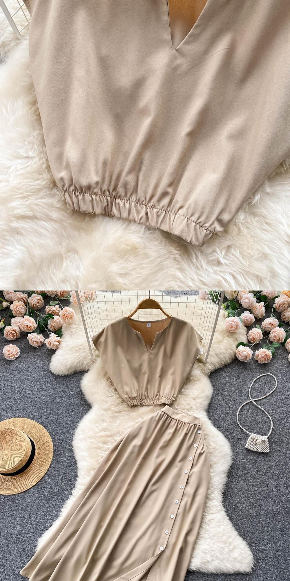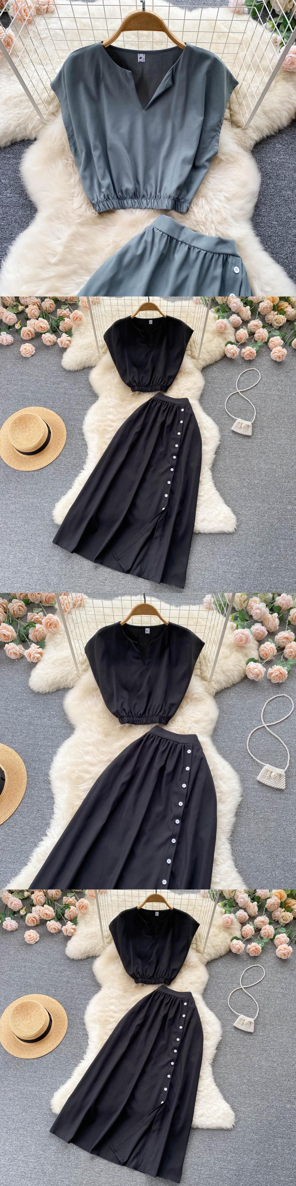 2022 ツーピースセット衣装プリーツスカートスーツ女性ジャンパークロップトップスノースリーブボタンスリットドレスニット 2 ピースセット Abe22582990297