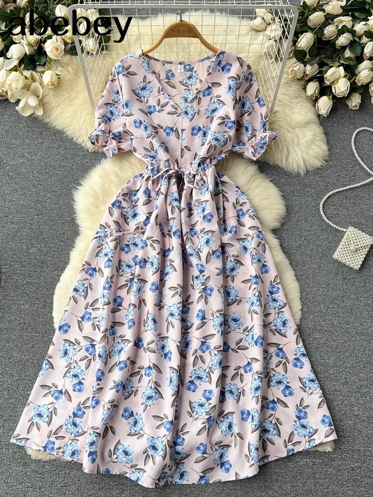 花 V ネックドレス女性パフスリーブウエストスリムドレス女性ができるレトロオーバーニードレス夏 2022 サマー 夏物 花柄 Vネック Abe94049056484