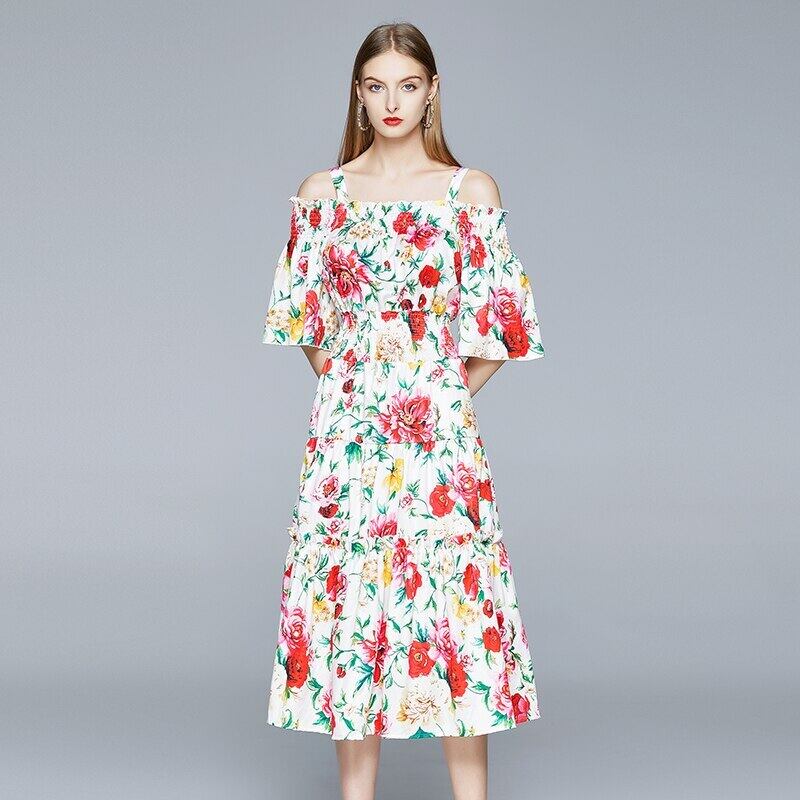 est 2020 サマーホリデードレス滑走路女性のローズプリントスパゲッティストラップセクシーなスラッシュネック弾性ウエストロングドレス エラスティック 伸縮 夏物 Rhc51384336766
